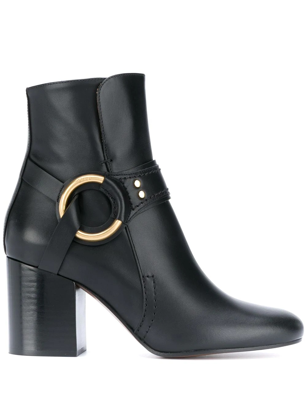 ring detail leather boots Even when times are hard, Chloe can be relied on for stunning boots. These black leather designs feature a bright gold-tone ring on the side, making them look powerful yet sleek. These world-beaters have us ready to jump back in the ring. Highlights - Black - Leather - Almond toe - Side zip fastening - Tonal stitching - Gold-tone hardware - High block heel Made in Italy Composition Outer: Leather 100% Lining: Leather 100% Sole: Leather 100% SIZE & FIT Measurement CIRCUMFERENCE 9.05 in(23 cm) HEEL 2.75 in(7 cm) HEIGHT 5.11 in(13 cm)