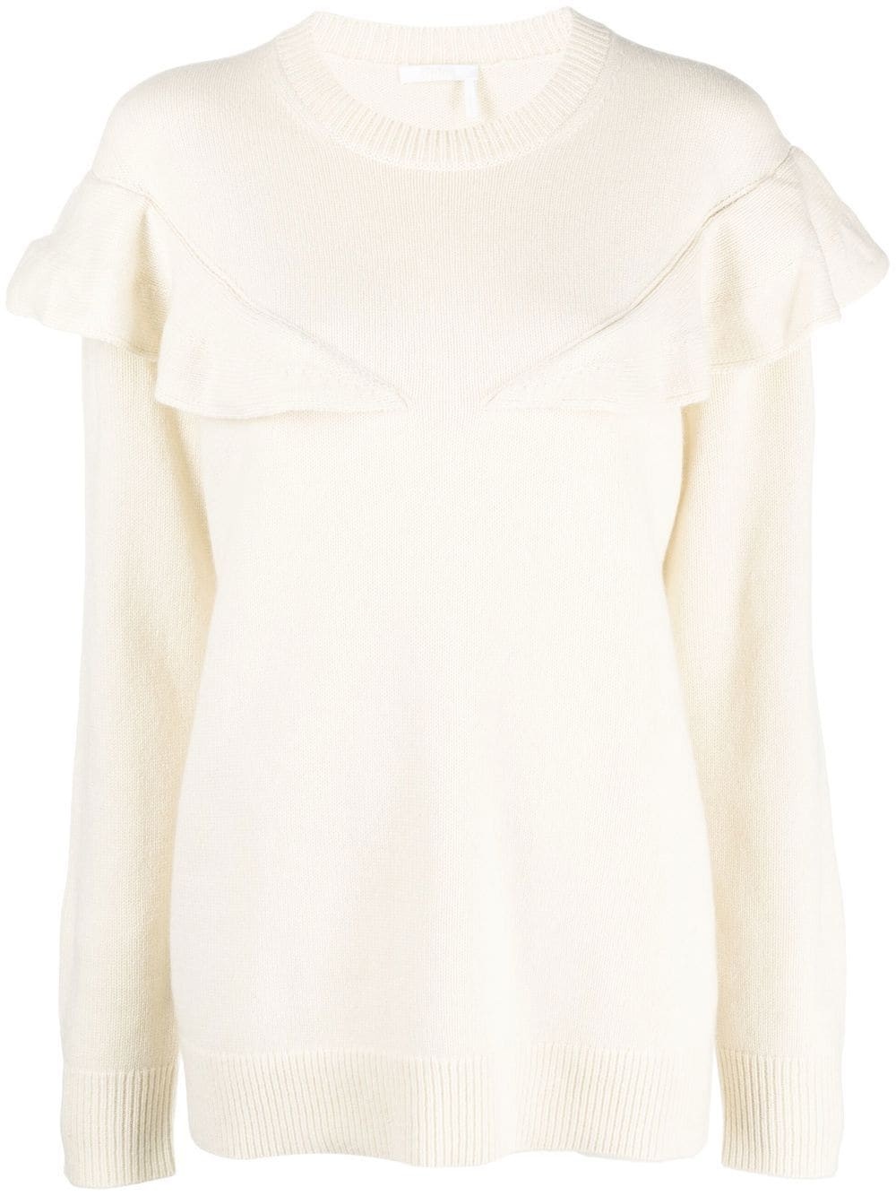 ruffle-trim cashmere jumper cream white cashmere ruffled trim ribbed-knit edge crew neck drop shoulder long sleeves straight hem Imported Composition Cashmere 100% SIZE & FIT Model measurements Height 5 ft 10 in(1.78 m) Bust/Chest 31.49 in(80 cm) Hips 36.22 in(92 cm) Waist 25.59 in(65 cm) Washing instructions Dry Clean Only