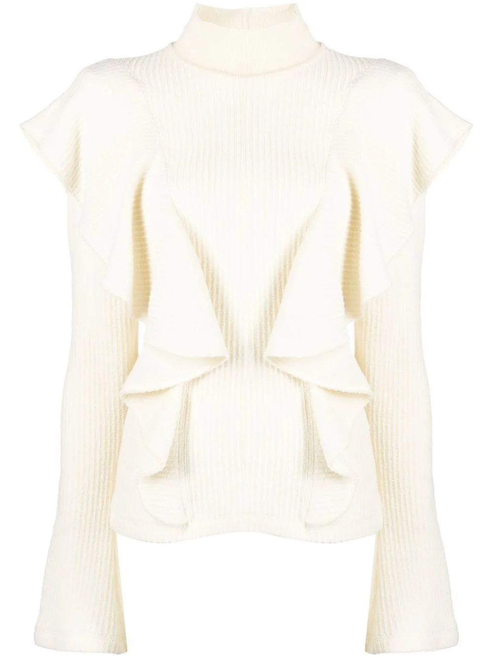 ruffled high-neck jumper Spun from a delicate blend of virgin wool in Italy, this cream-white jumper from Chloe is elevated with a high neck and ruffled panels at the shoulder and sides evocative of the French label's romantic and whimsical take on knitwear for AW22. Made in Italy Composition Virgin Wool 100% SIZE & FIT Model measurements Height 5 ft 10 in(1.79 m) Bust/Chest 31.1 in(79 cm) Hips 35.03 in(89 cm) Waist 24.01 in(61 cm) FittingInformation This piece fits true to size. We recommend you get your regular size Cut for a slim fit Made with a mid-weight fabric Washing instructions Dry Clean Only