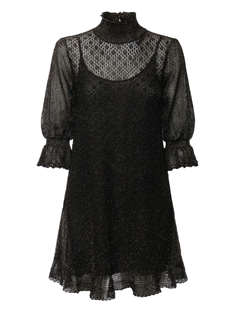 ruffled high-neck mini dress Highlights - Black - Ruffled trims - High neck - Three-quarter sleeves - Rear button fastening Imported Composition Viscose 83%, Metallized Polyester 17% Washing instructions Read Manufacturer Guidelines