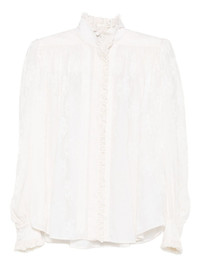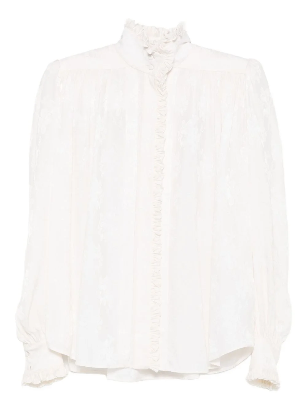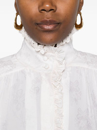 ruffled jacquard blouse Highlights - White - Silk - Jacquard pattern - Ruffled collar - Elasticated cuffs - Curved hem Imported Composition Silk 100% Washing instructions Read Manufacturer Guidelines