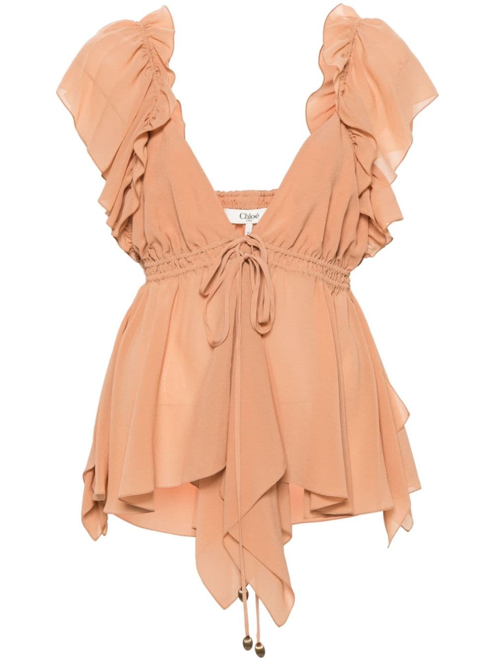 ruffled sleeveless silk blouse Highlights - Blush beige - Silk - Georgette - Ruffled trim - Plunging v-neck - Cap sleeves - Fitted waistline - Square open back - Ruffle hem - Drawstring fastening Imported Composition Silk 100% SIZE & FIT Model measurements Height 5 ft 11 in(1.8 m) Bust/Chest 32.67 in(83 cm) Hips 35.82 in(91 cm) Waist 25.98 in(66 cm) FittingInformation Designed for a close fit at the chest with a loose fit over the waist and hips The adjustable drawstring means that you can adjust this piece’s fit to suit your comfort and preference Made from a lightweight non-stretch fabric This piece fits true to size – take your usual size