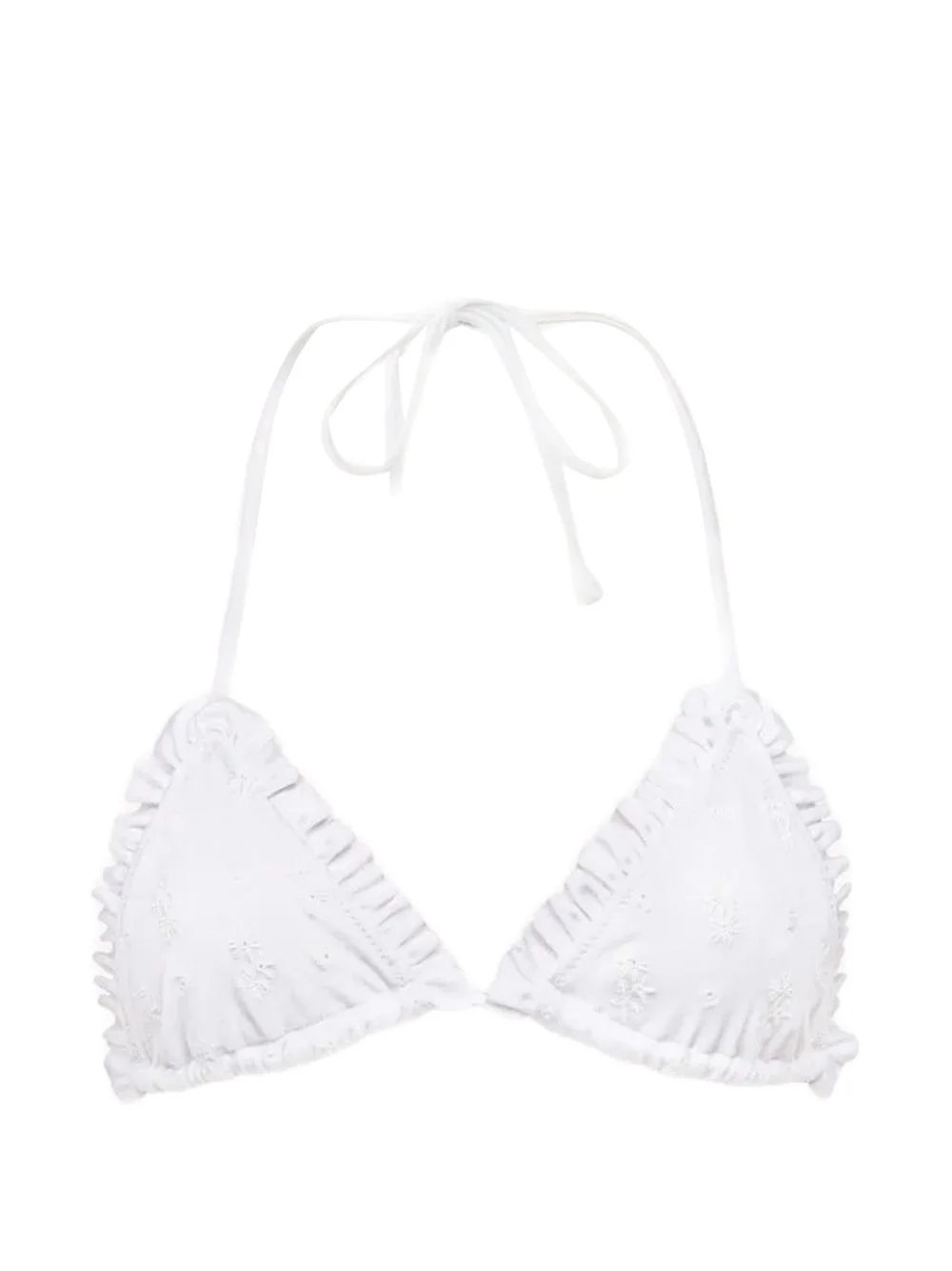 ruffled-trim floral-embroidered bikini top Highlights - White - Floral embroidery - Ruffled trim - Self-tie fastening - Be mindful to try on swimwear over your own garments. Made in France Composition Polyamide 80%, Elastane 20% Washing instructions Read Manufacturer Guidelines
