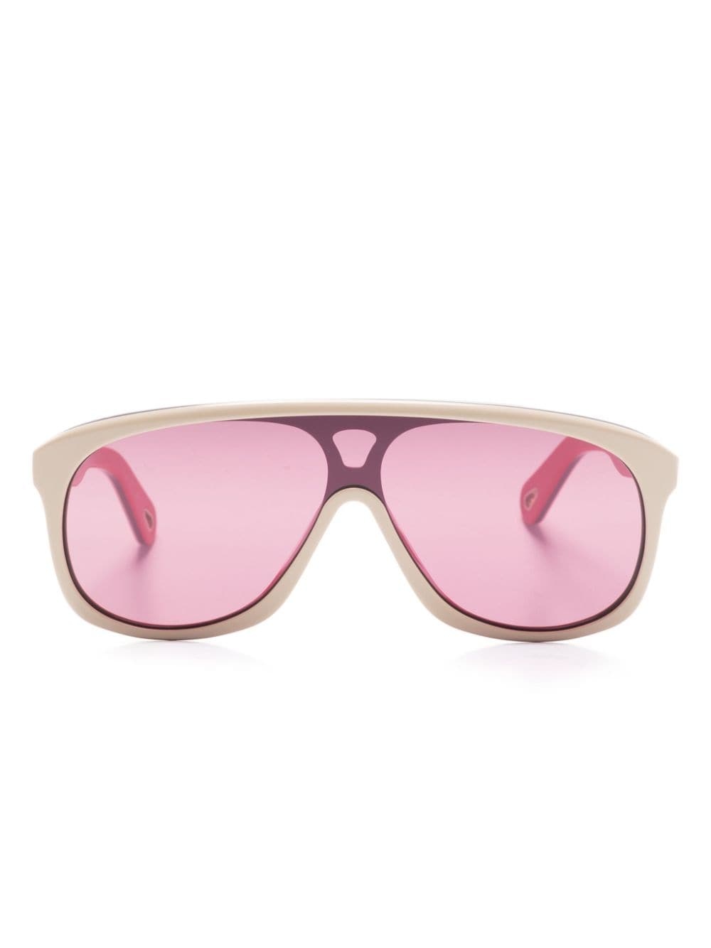 shield-frame logo-engraved sunglasses Highlights - Light pink/bright red - Acetate - Shield frame - Pink tinted lenses - Uv protection - Logo-engraved arm - Straight arms - Curved tips - These glasses come with a protective case. Made in Italy Composition Acetate 100% SIZE & FIT Measurement Arm Length 5.51 in(14 cm) Bridge Width 0.7 in(1.8 cm) Lens Diameter 2.48 in(6.3 cm) Total Width 5.9 in(15 cm)