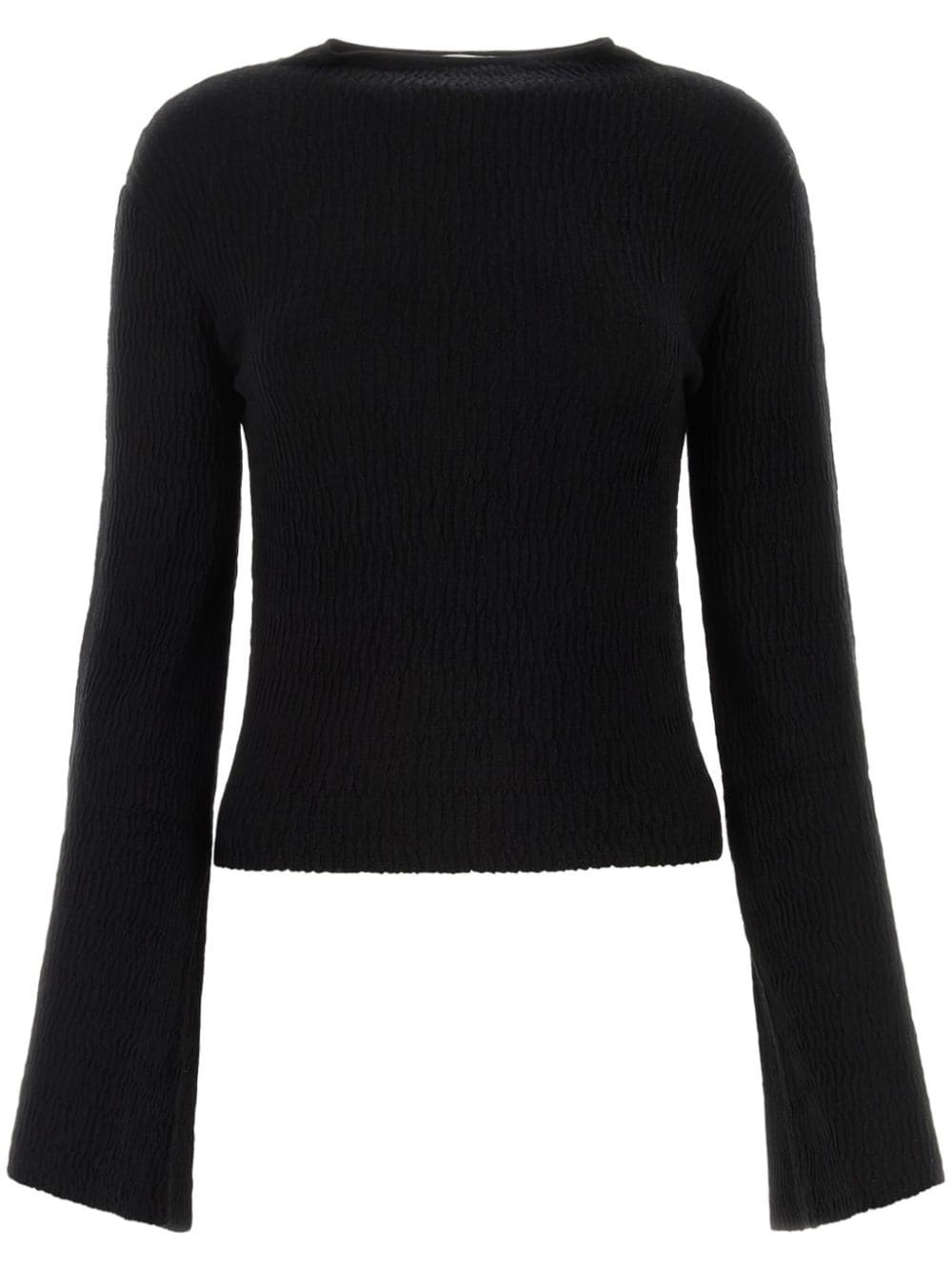 silk-blend knitted jumper Highlights - Black - Silk blend - Knitted construction - Round neck - Ruched bodice - Long sleeves - Flared cuffs - Straight hem Imported Composition Silk 67%, Linen/Flax 29%, Polyamide 3%, Spandex/Elastane 1% Washing instructions Read Manufacturer Guidelines