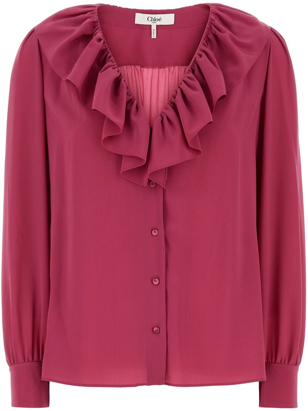 silk blouse Highlights - Dark pink - Front button fastening - Buttoned cuffs - Ruffled detailing - V-neck Made in France Composition Silk 100% SIZE & FIT Measurement SLEEVE LENGTH 24.01 in(61 cm) LENGTH 25.98 in(66 cm) WAIST 44.09 in(112 cm)