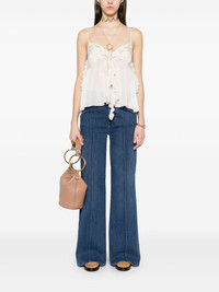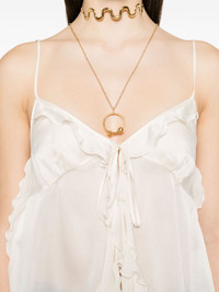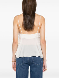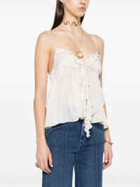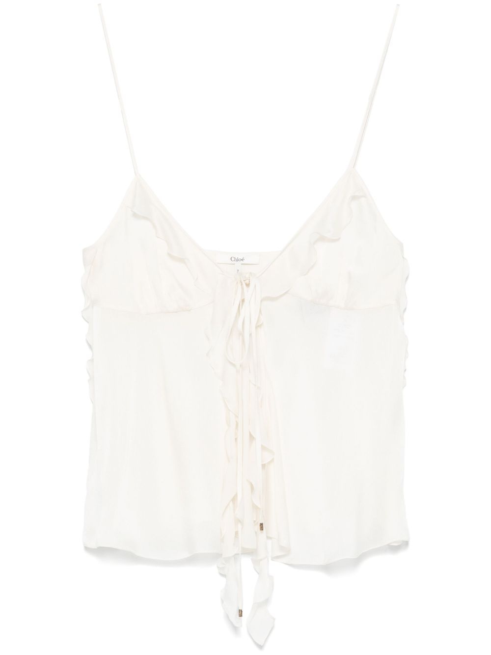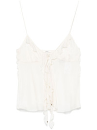 silk top Highlights - White - Front tie fastening - Ruffled detailing - Thin shoulder straps - V-neck Imported Composition Silk 100% SIZE & FIT Model measurements Height 5 ft 10 in(1.78 m) Bust/Chest 33.85 in(86 cm) Hips 36.61 in(93 cm) Waist 26.77 in(68 cm) FittingInformation Designed for a slim fit that sits just away from the body offering a close yet comfortable fit Made from a lightweight non-stretch fabric Washing instructions Dry Clean Only