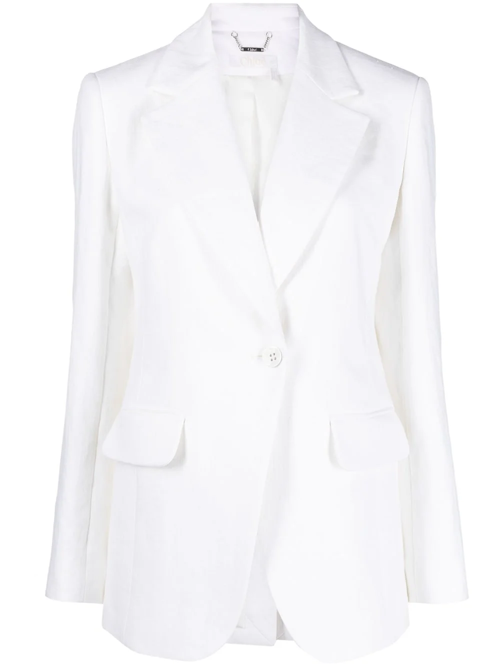 single-breasted blazer Chloe gives the classic single-breasted a warm-weather update. Crafted from a linen and cotton blend, classic hallmarks such as the notched lapels and flap pockets provide soft structure. Imported Composition Outer: ceramic 100%, Buffalo Horn 100%, Linen/Flax 97%, Cotton 3% Lining: Silk 100% SIZE & FIT Model measurements Height 5 ft 10 in(1.78 m) Bust/Chest 30.7 in(78 cm) Hips 34.64 in(88 cm) Waist 23.22 in(59 cm) Measurement SLEEVE LENGTH 17.32 in(44 cm) LENGTH 30.31 in(77 cm) WAIST 33.85 in(86 cm) BUST 36.22 in(92 cm) FittingInformation Designed for a slim fit that sits just away from the body offering a close yet comfortable fit The internal shoulder pads offer a structured shape Made from a midweight non-stretch fabric This piece fits true to size – take your usual size