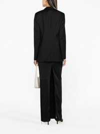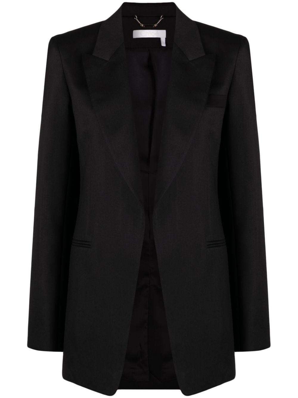 single-breasted tuxedo blazer Chloe's refined style is showcased in this tuxedo jacket for SS23. Crafted from wool silk crepe, this blazer is tailored to a fitted single-breasted silhouette. Clean lines and a buttonless construction lend it a minimalist feel. Highlights - Black - Wool-silk blend - Peak lapels - Long sleeves - Chest welt pocket - Two side welt pockets Made in Italy Composition Outer: Wool 86%, Silk 14% Lining: Silk 100% SIZE & FIT Model measurements Height 5 ft 10 in(1.77 m) Bust/Chest 32.67 in(83 cm) Hips 35.43 in(90 cm) Waist 23.62 in(60 cm)