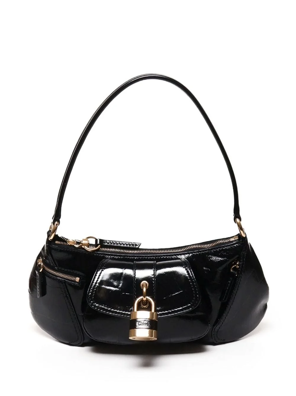 The 99 shoulder bag Highlights - Black - Calf leather - Embossed crocodile effect - Top zip fastening - Single shoulder strap - Front zip fastening pockets - Front flap pocket - Padlock detail - Main compartment - Internal slip pocket - Internal logo patch - Cotton-linen lining Made in Italy Composition Lining: Cotton 54%, Linen/Flax 46% Outer: Calf Leather 100% SIZE & FIT Measurement DEPTH 3.93 in(10 cm) HANDLE 11.02 in(28 cm) HEIGHT 5.11 in(13 cm) WIDTH 14.17 in(36 cm)