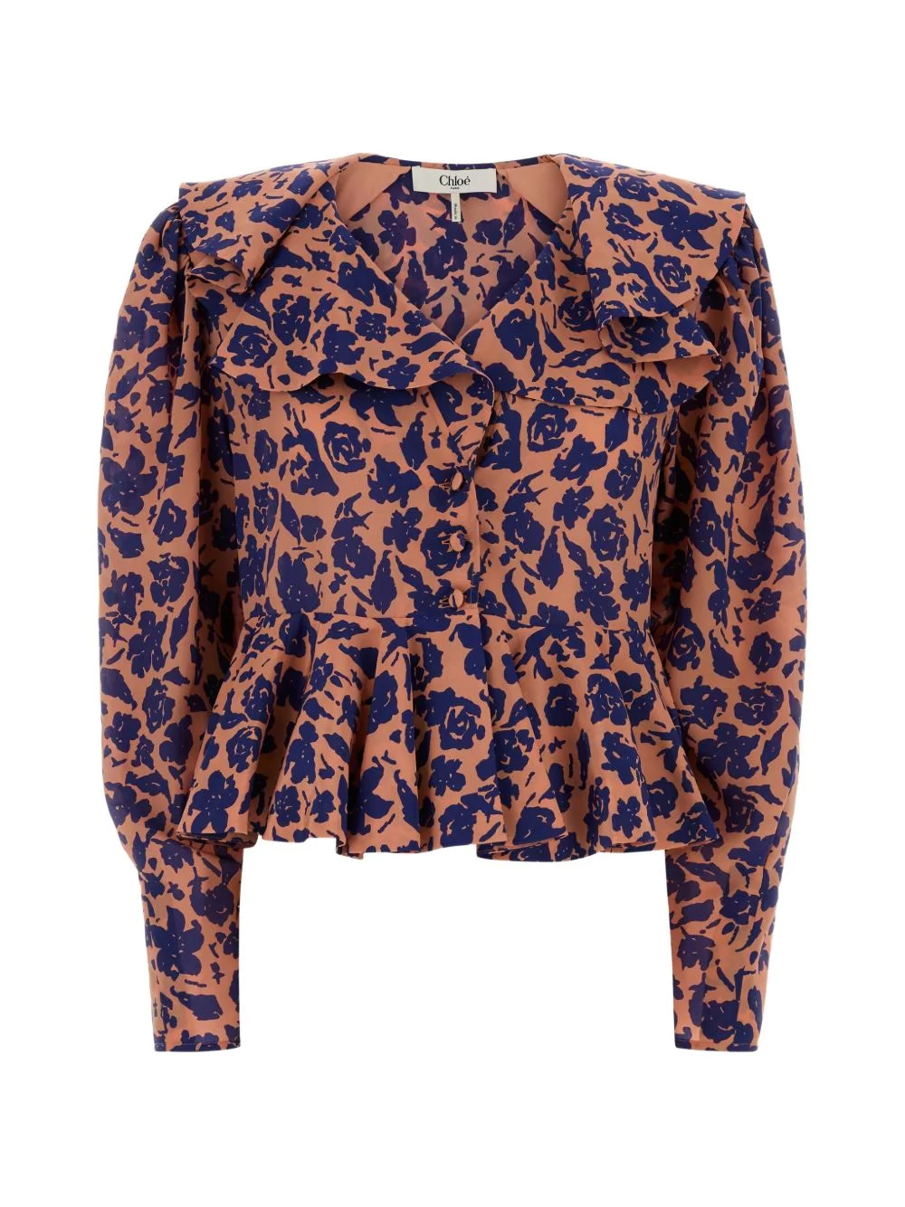 V-neck ruffled blouse Highlights - Pink - All-over floral print - Ruffled collar - Long sleeves - Front button fastening - Peplum hem Made in Italy Composition Outer: Silk 100% Lining: Acetate 76%, Silk 24% Washing instructions Read Manufacturer Guidelines
