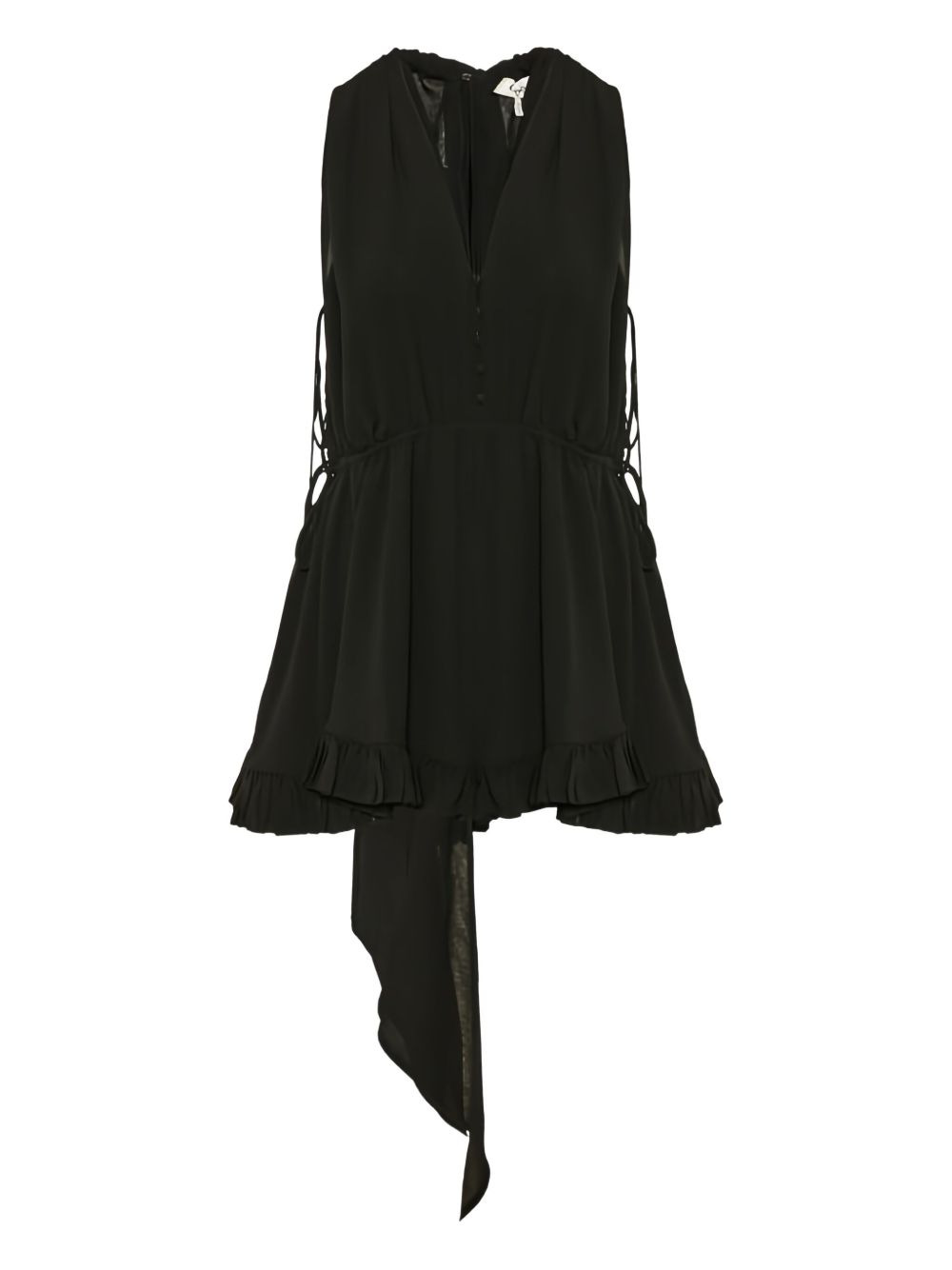 V-neck ruffled playsuit Highlights - Black - Silk - Ruffled hem - Drawstring waist - Sleeveless - V-neck - Button detailing Made in France Composition Silk 100% Washing instructions Read Manufacturer Guidelines