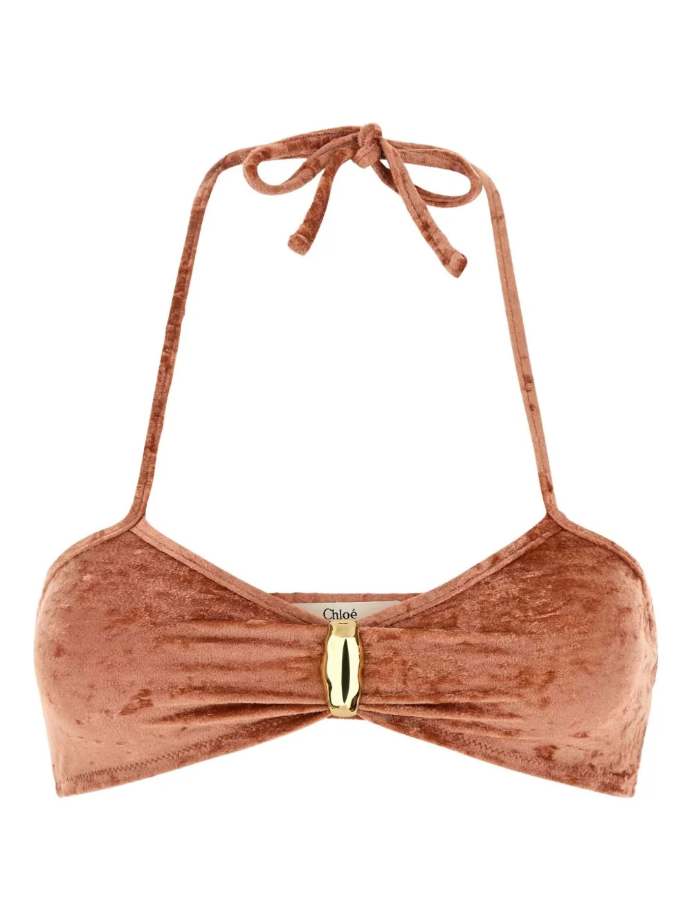 velvet tie bikini top Highlights - Peach - Velvet effect - Tie fastening - Gold-tone hardware - Be mindful to try on swimwear over your own garments. Made in Italy Composition Outer: Nylon 85%, Spandex/Elastane 15% Lining: Nylon 86%, Spandex/Elastane 14% Washing instructions Read Manufacturer Guidelines