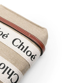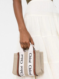 Woody linen tote bag An instantly recognisable style from the brand, the Woody bag' is adorned with vertical leather strips and the signature Chloe logo ribbon carried over from the label's Woody mule. For AW22, the label introduces this beige iteration that is crafted from soft linen. Made in Italy Composition Outer: Calf Leather 100%, Linen/Flax 100% Lining: Linen/Flax 100% SIZE & FIT Model measurements Height 5 ft 11 in(1.8 m) Bust/Chest 31.49 in(80 cm) Hips 35.82 in(91 cm) Waist 24.8 in(63 cm) Measurement DEPTH 1.57 in(4 cm) HANDLE 2.75 in(7 cm) HEIGHT 5.51 in(14 cm) STRAP 20.07 in(51 cm) WIDTH 7.87 in(20 cm)