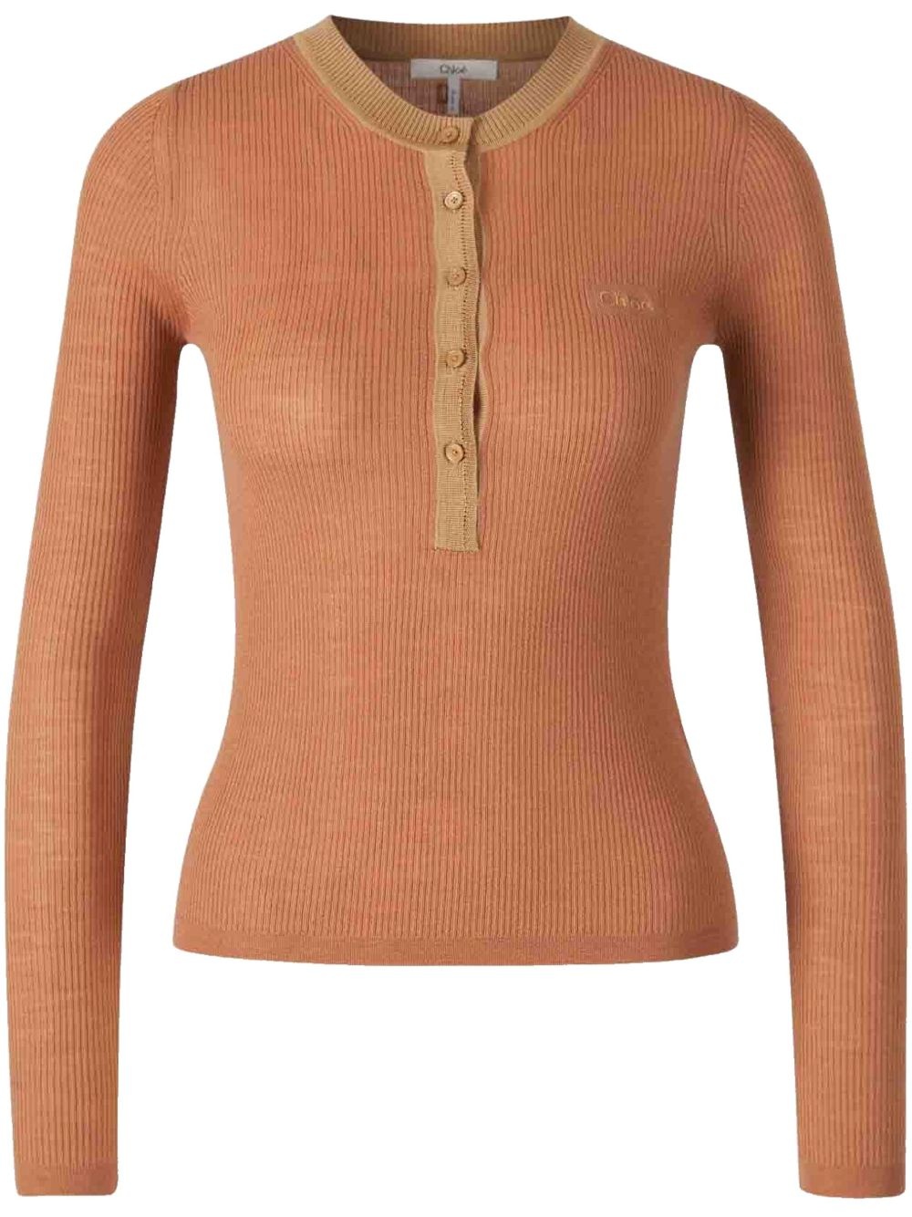 wool jumper Highlights - Coral pink - Front button placket - Long sleeves - Embroidered logo at the chest - Round neck Imported Composition Wool 100%, Mother of Pearl 100%, Silk 100% Washing instructions Dry Clean Only