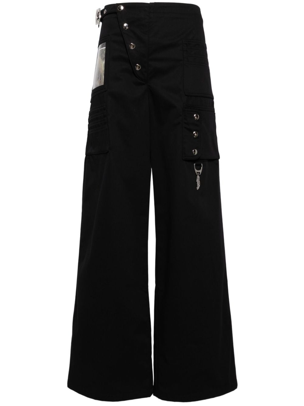 high-waisted wide-leg trousers Highlights - Jet black - Bci cotton - Silver-tone hardware - Decorative button detailing - Carabiner attachment - Off-centre front fastening - Press-stud fastening - High-waisted - Wide leg - Front patch pocket - Side flap pocket Imported Composition BCI Cotton 100% SIZE & FIT Model measurements Height 5 ft 11 in(1.8 m) Bust/Chest 31.1 in(79 cm) Hips 36.22 in(92 cm) Waist 25.98 in(66 cm) FittingInformation Designed with a wide-leg cut, these trousers allow for a close fit at the waist and offer a loose and roomy fit over the leg Made from a midweight non-stretch fabric This piece fits true to size – take your usual size Washing instructions Specialist Cleaning