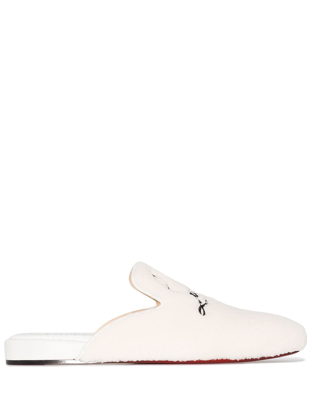 Navy Coolito Donna mules The Navy Coolito Donna mules are characterised by a terry wool upper in white that is contrasted by an embroidered signature of Christian Louboutin in contrasting black. The design is finished with a signature red-hued sole. Made in Italy Composition Lining: Leather 100% Sole: Rubber 100% Outer: Fabric 100% SIZE & FIT Model measurements Height 5 ft 10 in(1.78 m) Bust/Chest 30.7 in(78 cm) Hips 33.85 in(86 cm) Waist 22.44 in(57 cm) FittingInformation This piece fits true to size. We recommend you get your regular size Measurement HEEL 1.18 in(3 cm)