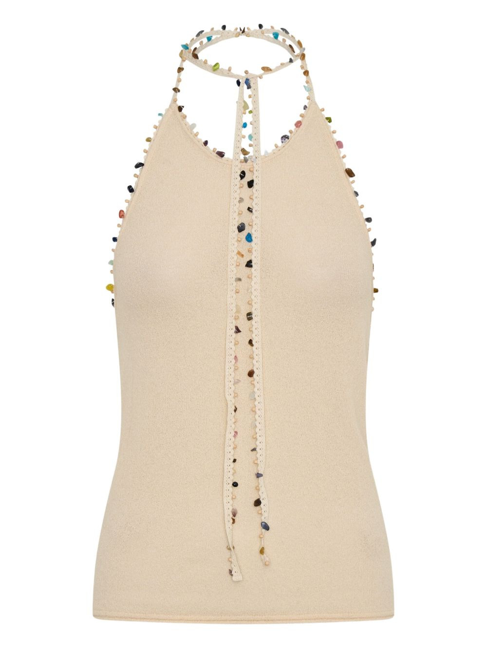 Beach Quartz halter-neck tank top Highlights - Light beige - Cotton-blend - Halter neck - Beaded embellishment - Tie fastening - Sleeveless Imported Composition Cotton 75%, Nylon 25% Washing instructions Read Manufacturer Guidelines
