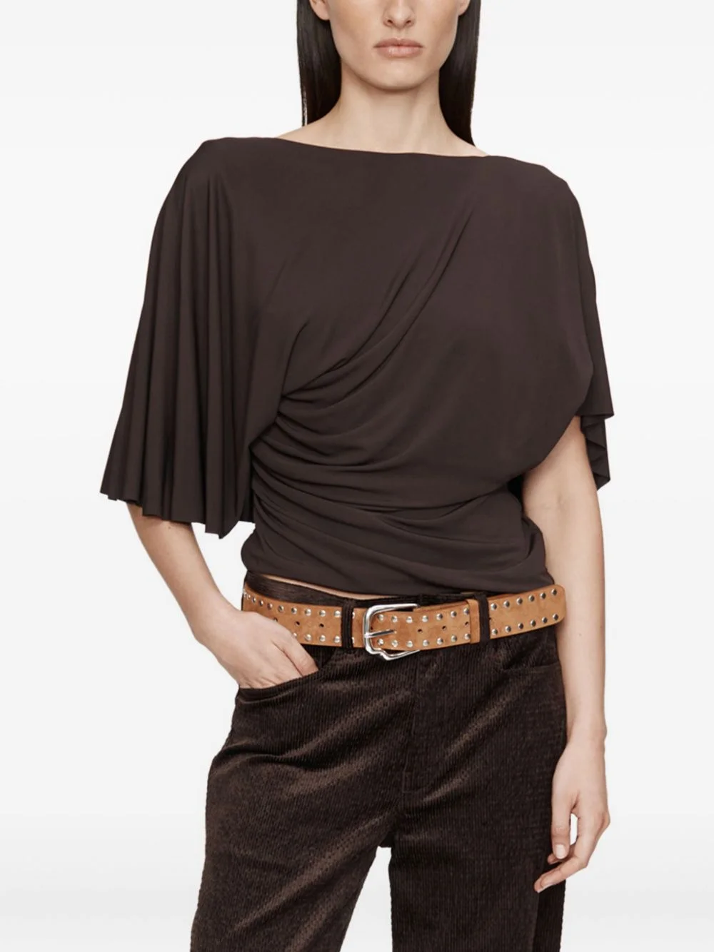 fluted jersey top Highlights - Brown - Open back - Short sleeves - Boat neck - Gathered-draped detail Imported Composition Viscose 100% Washing instructions Read Manufacturer Guidelines