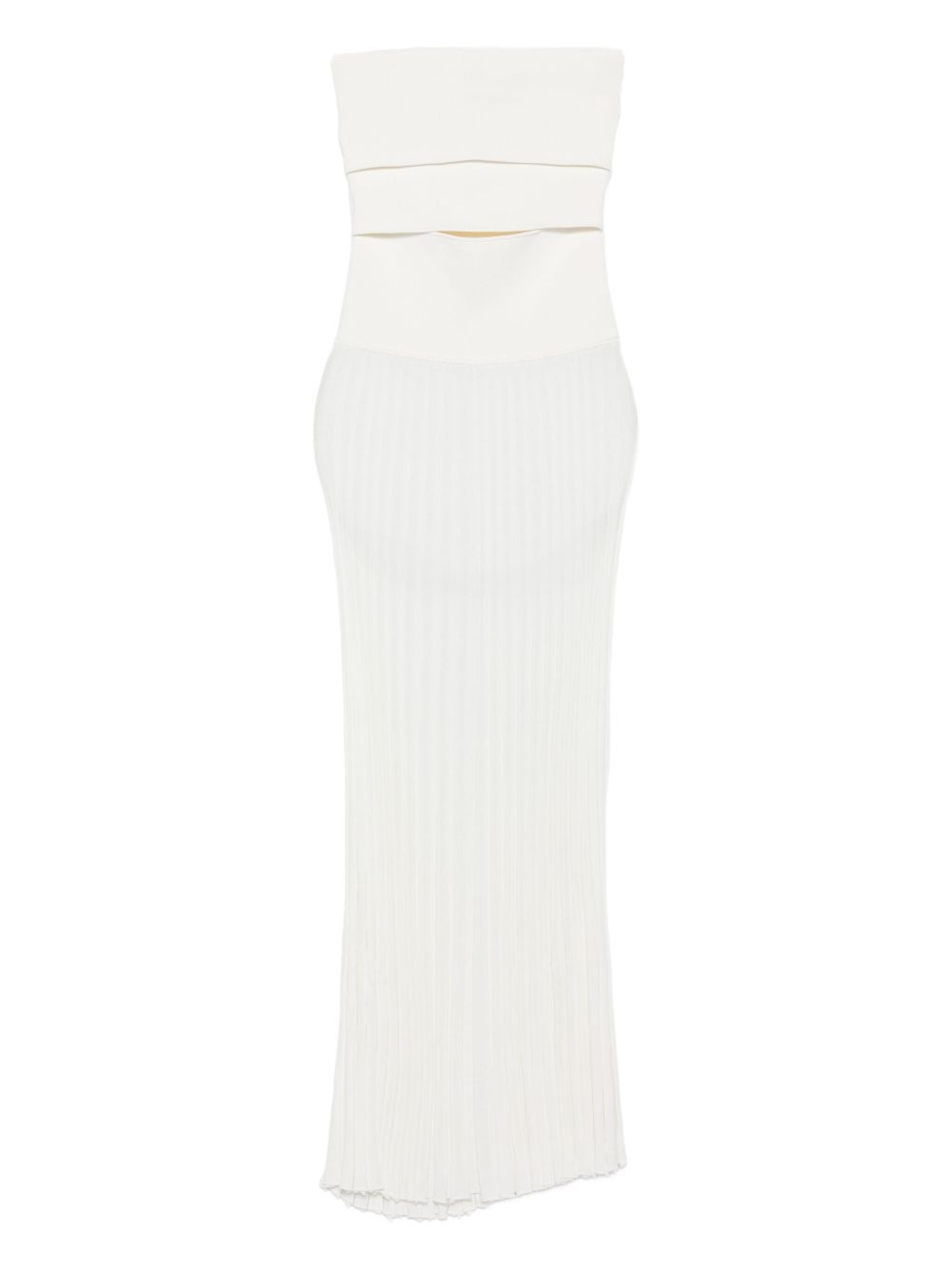 pleated strapless dress Highlights - White Imported Composition Viscose 65%, Nylon 35% SIZE & FIT Model measurements Height 5 ft 9 in(1.75 m) Bust/Chest 32.67 in(83 cm) Hips 36.22 in(92 cm) Waist 24.8 in(63 cm) FittingInformation Designed for a close fit throughout Made with a midweight knit, this piece offers some stretch Washing instructions Dry Clean Only