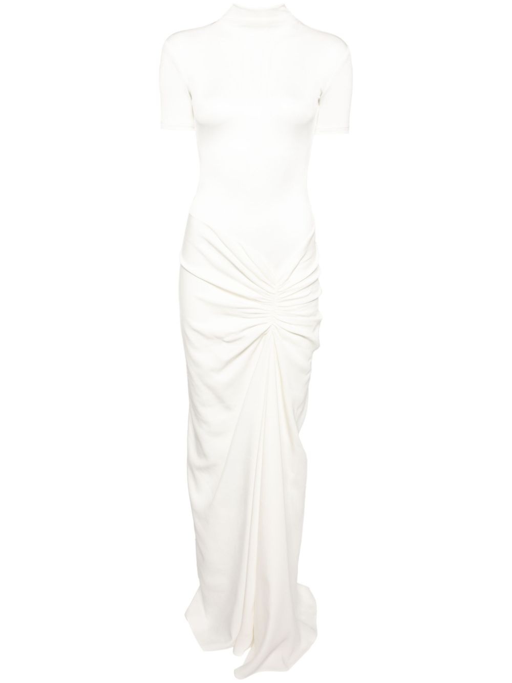 ruched gown Highlights - White - Knitted construction - Ruched detailing - Short sleeves - Mock neck - Straight hem Imported Composition Viscose 97%, Spandex/Elastane 3% Washing instructions Dry Clean Only