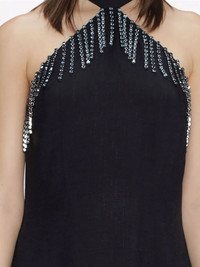 crystal-trim halterneck dress dark navy crystal embellishment halterneck sleeveless fitted waistline flared skirt Made in United Kingdom Composition Outer: Viscose 88%, Polyamide 12% Lining: Acetate 70%, Silk 30% SIZE & FIT FittingInformation This piece fits true to size. We recommend you get your regular size Washing instructions Dry Clean Only