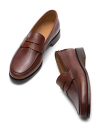 Milford leather penny loafers Highlights - Brown - Calf leather - Slip-on style - Branded leather insole - Penny slot - Moc stitching - Round toe - Leather sole Composition Sole: Leather 100% Outer: Calf Leather 100% Lining: Calf Leather 100% SIZE & FIT Measurement HEEL 0.78 in(2 cm)