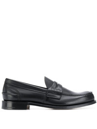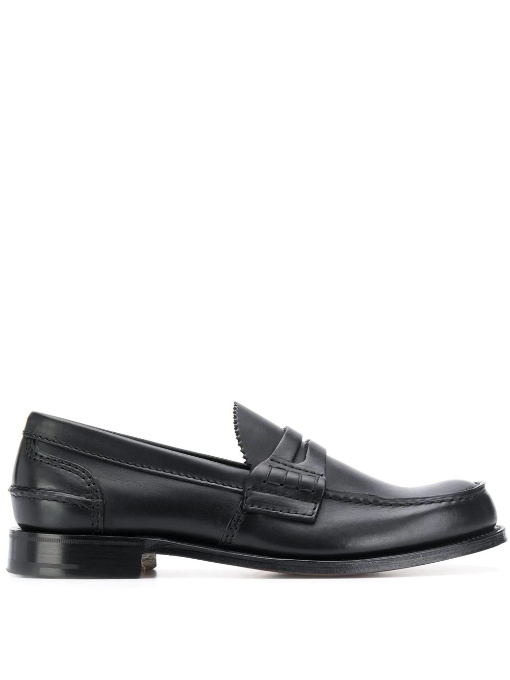 Pembrey leather loafers Is there anything more classic than this pair of Pembrey leather loafers from Church's? We've looked and nothing comes close. This timeless design will fast become an everyday essential. Highlights - Black - Leather - Penny strap - Tonal stitching - Round toe - Branded insole - Low stacked heel Composition Lining: Cotton 100%, Calf Leather 100% Outer: Calf Leather 100% Sole: Calf Leather 100% SIZE & FIT Measurement HEEL 0.98 in(2.5 cm) Sole height 0.39 in(1 cm)