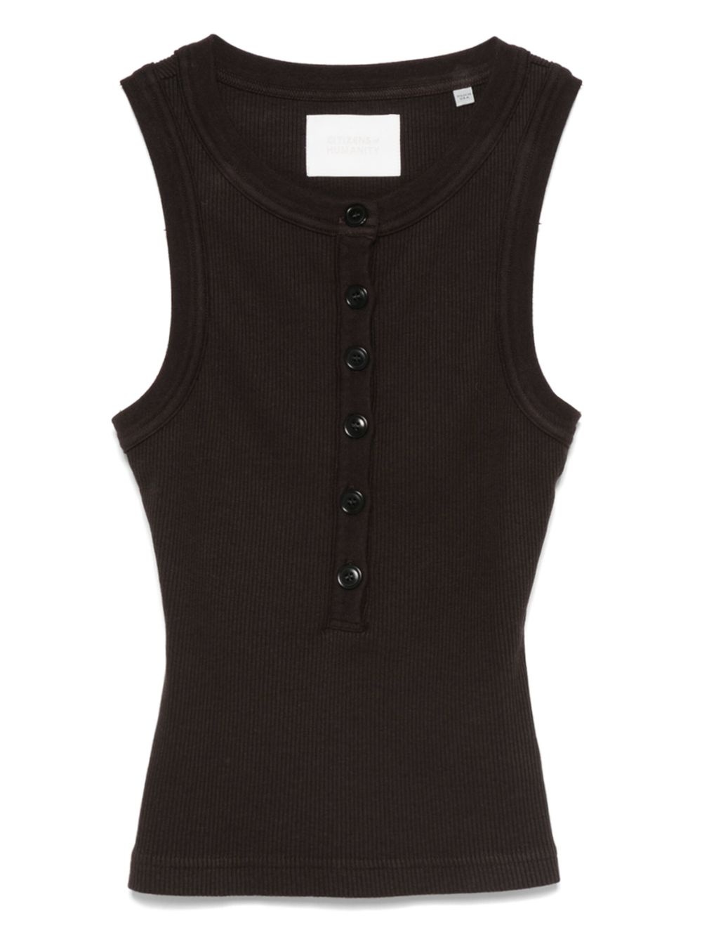 button-front ribbed top Highlights - Brown - Ribbed texture - Sleeveless - Round neck - Button placket Made in United States Composition Organic Cotton 49%, Lyocell 49%, Elastane 2% Washing instructions Machine Wash
