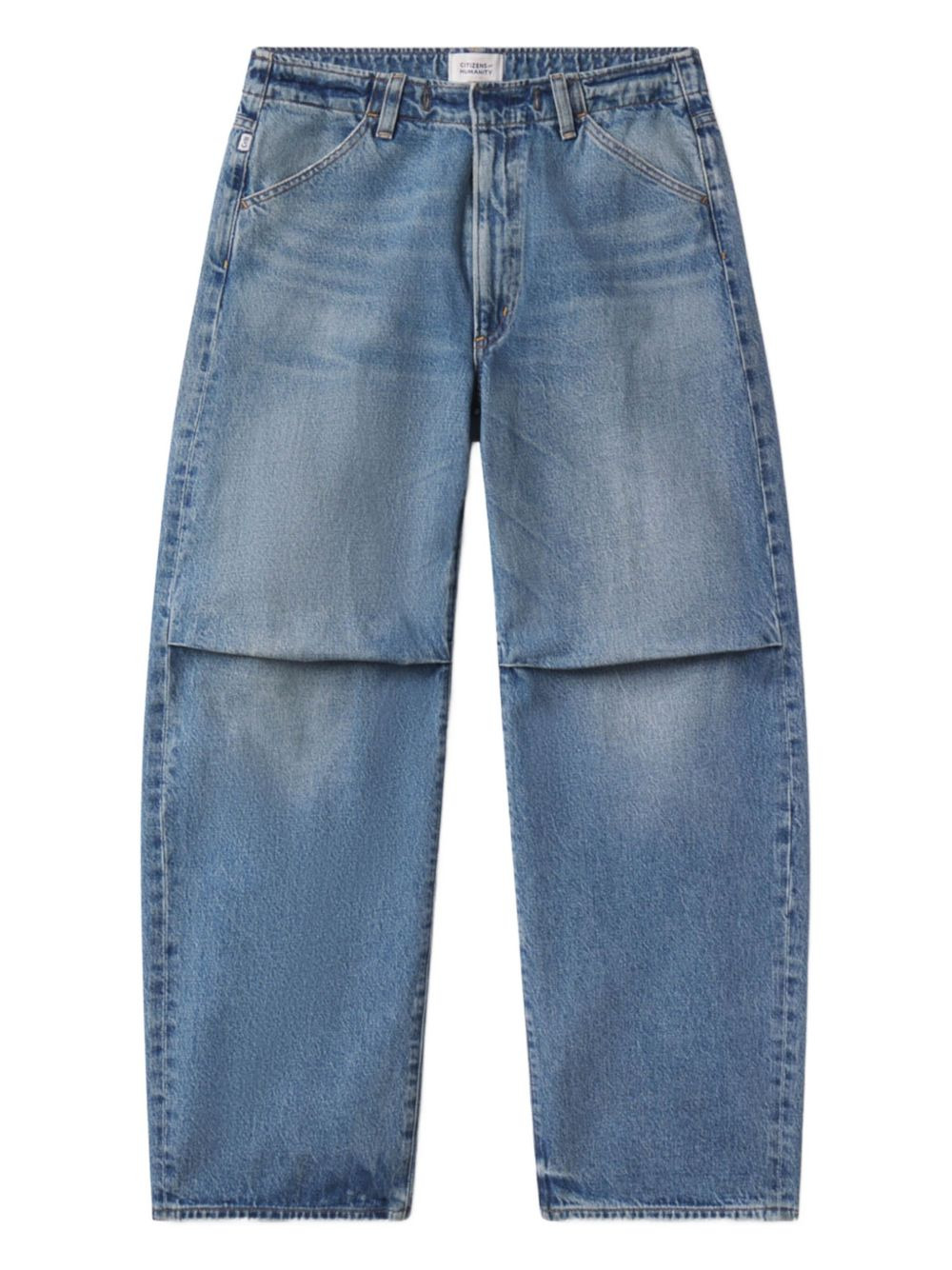 pleated-knee jeans Highlights - Blue - Pleated knee - Mid waist - Five pockets - Belt loops Imported Composition Regenerative Cotton 100% Washing instructions Read Manufacturer Guidelines