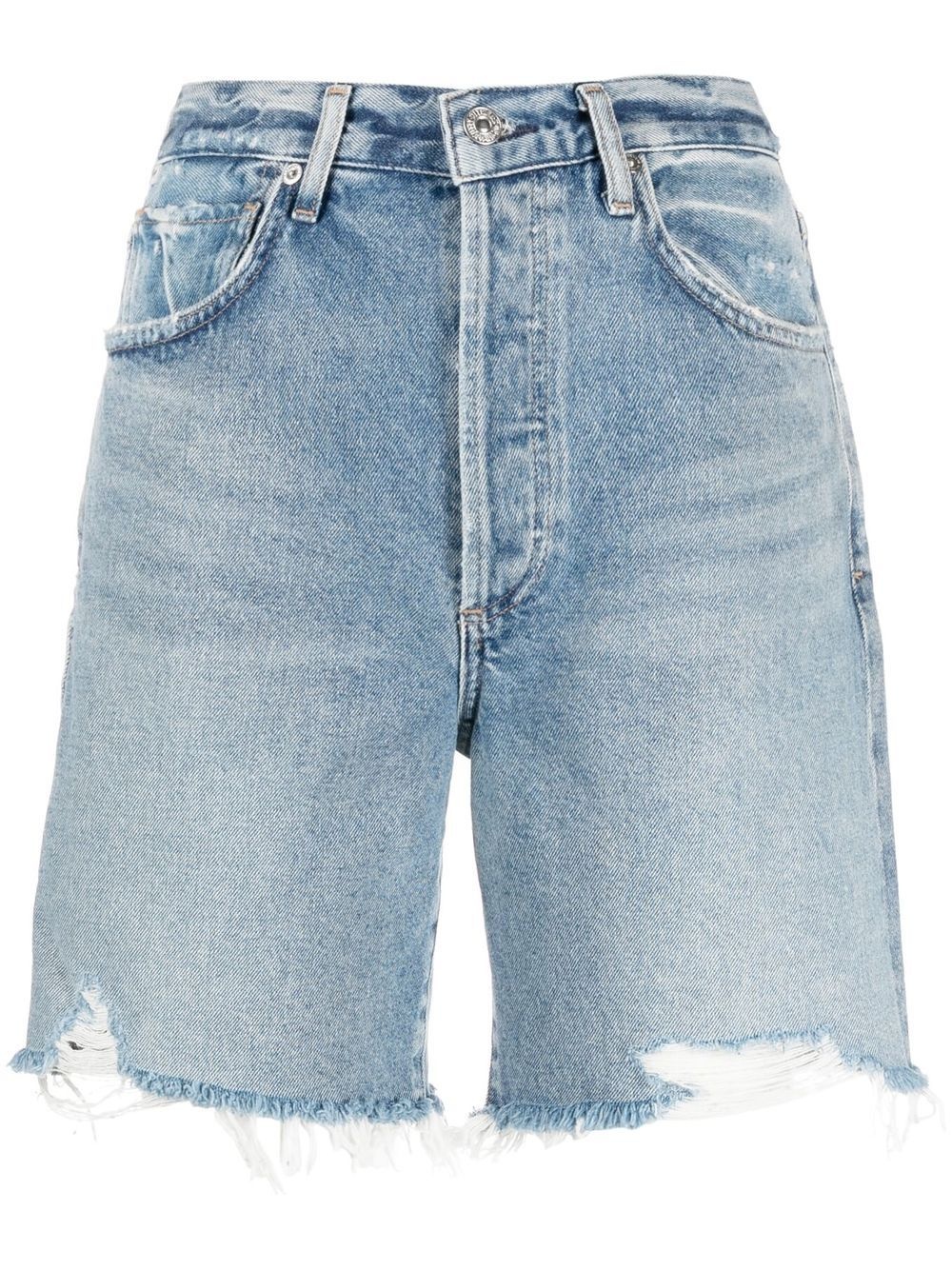 raw-hem denim shorts Citizens of Humanity presents its own take on classic denim. Made from cotton, these light-blue denim shorts feature distressed detailing and a raw-cut hem for a rebellious edge. Highlights - Light blue - Cotton - Distressed finish - Frayed hem - Logo patch to the rear - Belt loops - Concealed fly and button fastening - Classic five pockets Imported Composition Cotton 100% SIZE & FIT Model measurements Height 5 ft 11 in(1.8 m) Bust/Chest 31.49 in(80 cm) Hips 35.43 in(90 cm) Waist 25.19 in(64 cm) FittingInformation This piece fits true to size. We recommend you get your regular size Designed to be fitted at the waist and hips, loose over the leg Made with a mid-weight non-stretch fabric Washing instructions Machine Wash