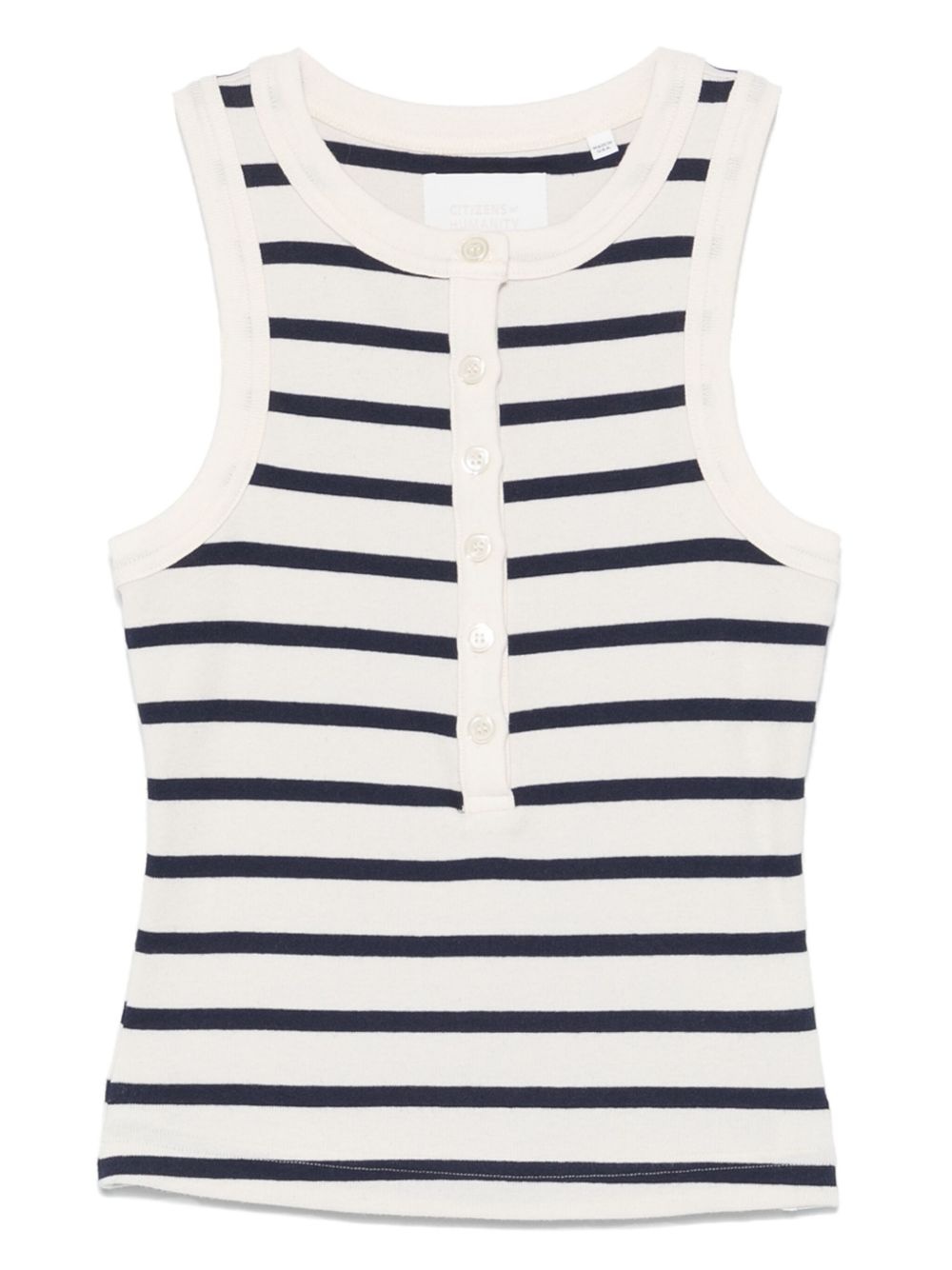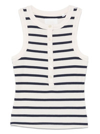 striped tank top Highlights - White - Front button placket - Crew neck - Sleeveless Made in United States Composition Cotton 90%, Polyester 10% Washing instructions Machine Wash