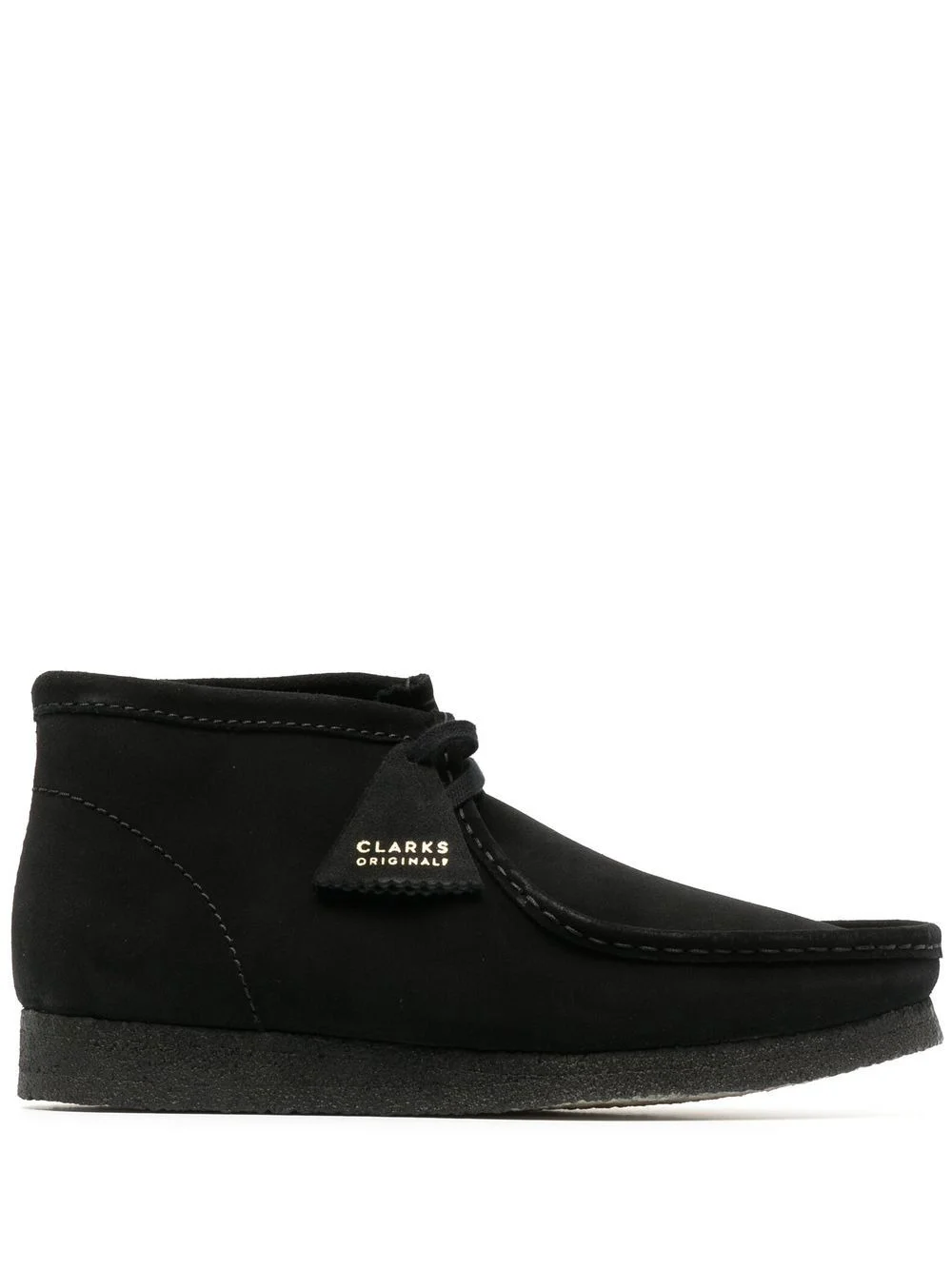 Wallabee ankle-length boots The Wallabee has become an iconic style from Clarks Originals thanks to its moccasin construction and structural silhouette. Featuring clean lines, this lace-up boot iteration is made from black suede and teamed with the label's signature crepe sole for added comfort. Imported Composition Lining: Sheepskin 100% Outer: Suede 100% Sole: Rubber 100% SIZE & FIT Measurement HEEL 1.37 in(3.5 cm) HEIGHT 4.33 in(11 cm) Sole height 0.78 in(2 cm)