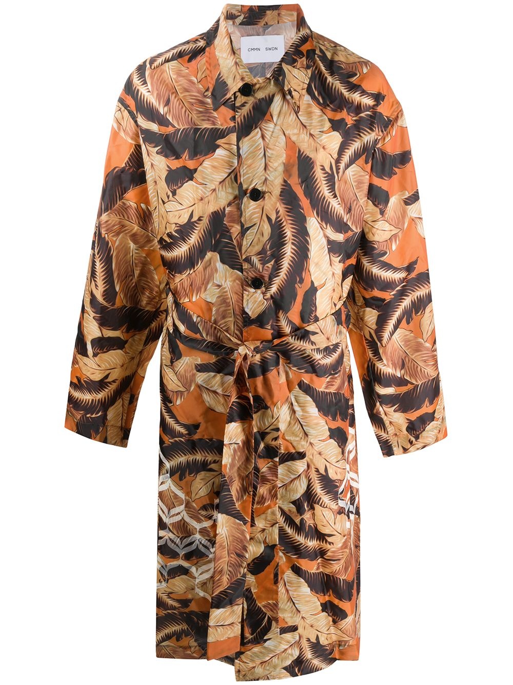 leaf-print belted trench coat Orange leaf-print belted trench coat from Cmmn Swdn featuring a foliage print, a classic collar, a front button fastening, long sleeves and a belted waist. Imported Composition Polyester 100% SIZE & FIT Model measurements Height 6 ft 1 in(1.85 m) Bust/Chest 37.79 in(96 cm) Hips 37.4 in(95 cm) Waist 30.7 in(78 cm) FittingInformation This piece fits true to size. We recommend you get your regular size Cut for a loose fit Made with a lightweight non-stretch fabric