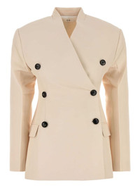 double-breasted blazer Highlights - Beige - Structured shoulders - Peak lapels - Front pockets - Double-breasted contrasting black buttons - Back vent Imported Composition Lining: Viscose 100% Outer: Viscose 70%, Virgin Wool 30%