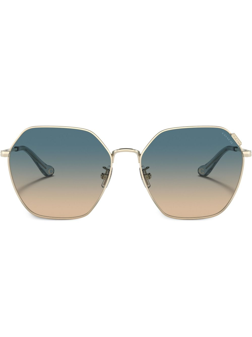 HC7132 C7998 hexagonal-frame sunglasses Highlights - Gold-tone - Metal - Hexagonal frame - Gradient lenses - Nose pads - Logo-engraved arm - Straight arms - Curved tips - These glasses come with a protective case. Made in United States Composition Metal 100% SIZE & FIT Measurement Arm Length 5.51 in(14 cm) Bridge Width 0.62 in(1.6 cm) Lens Diameter 2.28 in(5.8 cm)