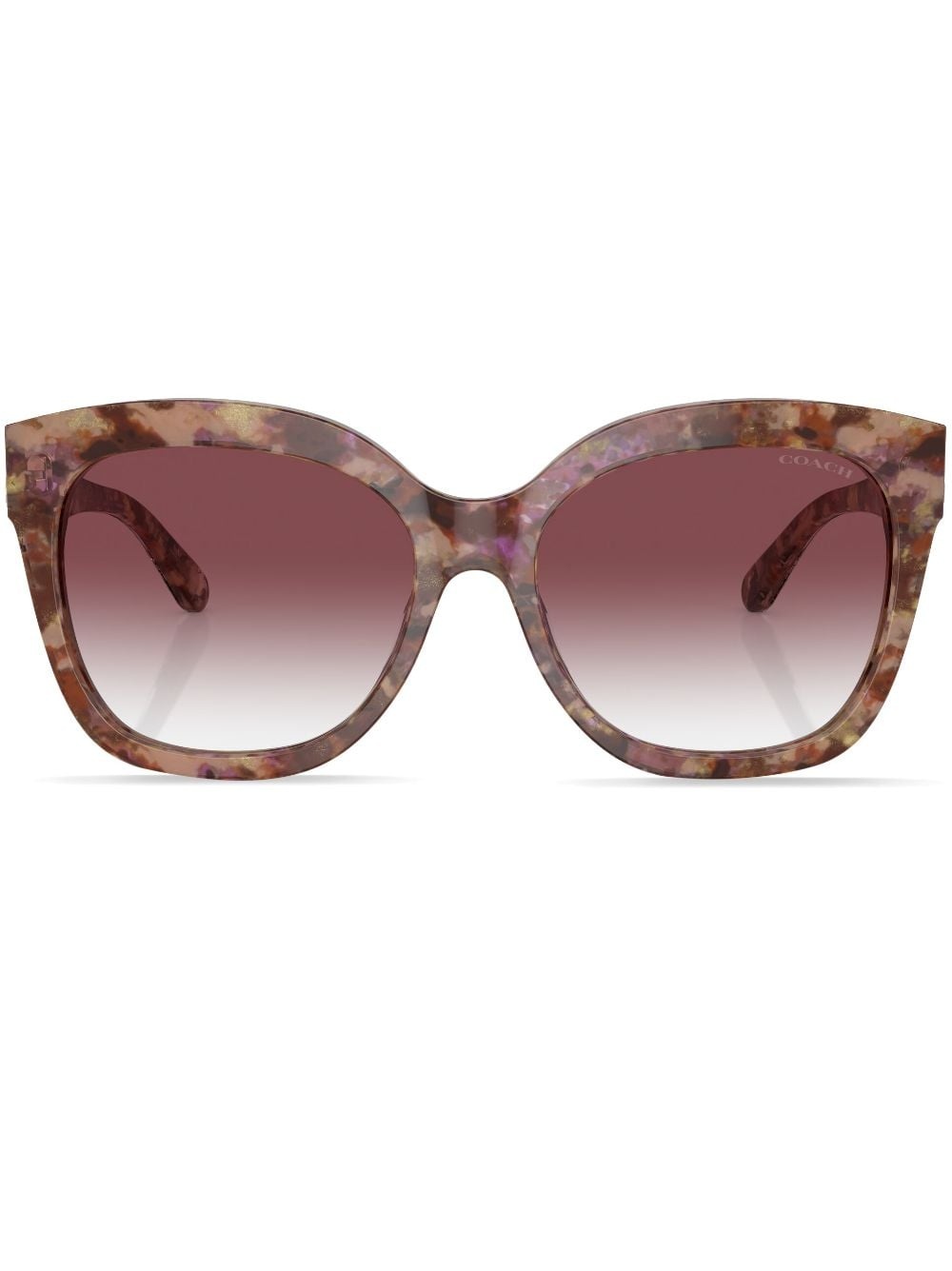 L1083 square-frame sunglasses Exuding Coach's charming aesthetic, these square-frame sunglasses boast a tortoiseshell design punctuated with blooming petals, while the brand's iconic Horse and Carriage motif appears at the arms for a finishing touch. Highlights - Brown - Acetate - Tortoiseshell effect - Floral print - Square frame - Purple tinted lenses - Logo plaque at the arm - Straight arms - Curved tips - These glasses come with a protective case. Made in United States Composition Acetate 100%