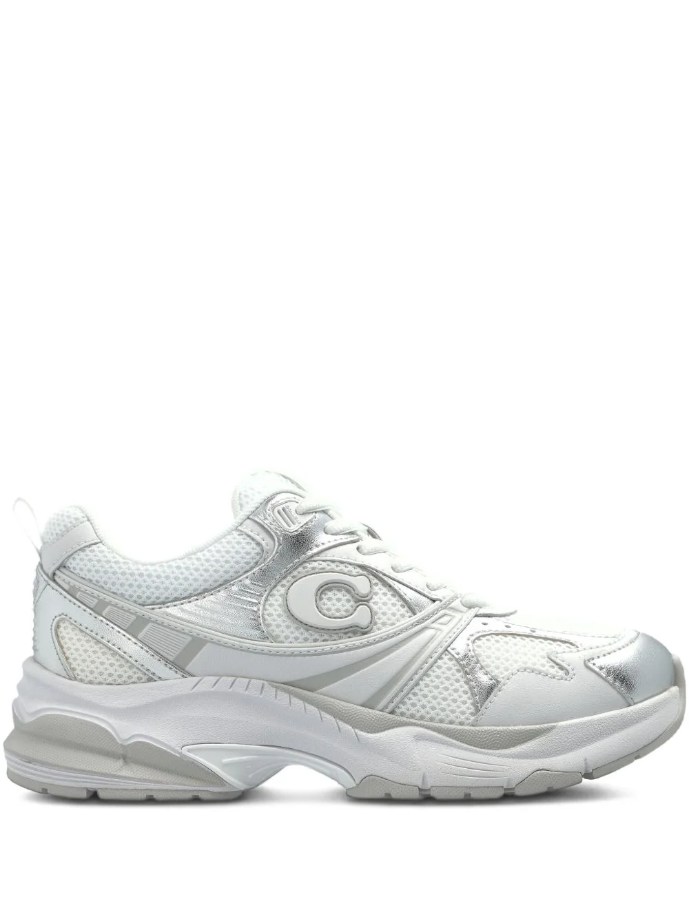 logo-applique sneakers Highlights - White - Front lace-up fastening - Pull-tab at the heel - Chunky rubber lug sole - Metallic effect Imported Composition Outer: Cotton 100%, Rubber 100%, Metallic Leather 100% Sole: Rubber 100% Lining: Mesh 100%