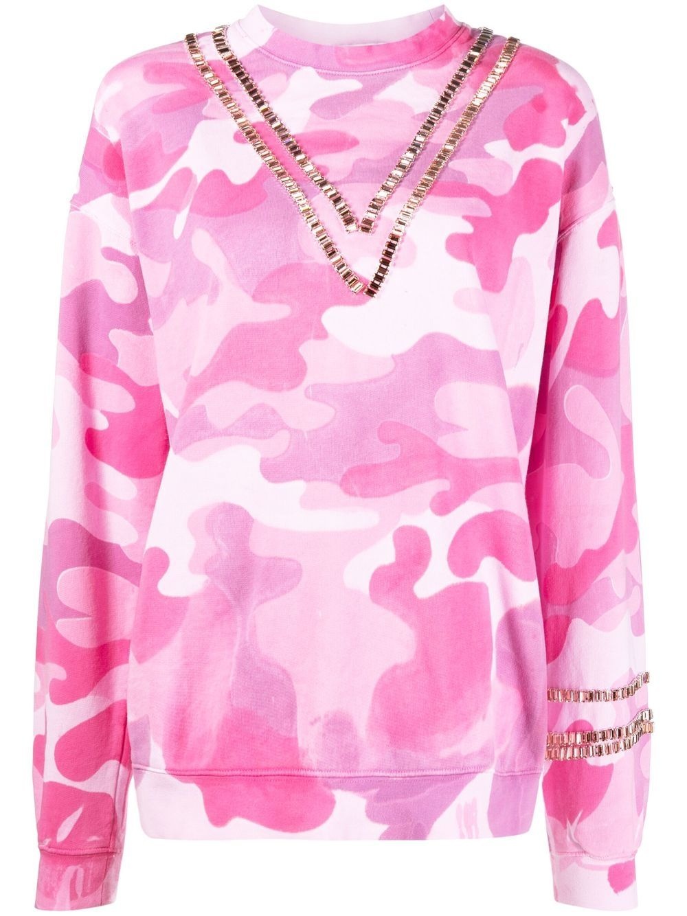 camouflage-print crystal-embellished sweatshirt Highlights - Bright pink/white - Cotton - Jersey fleece - Camouflage print - Crystal embellishment - Crew neck - Long sleeves - Straight hem Imported Composition Cotton 100% SIZE & FIT Model measurements Height 5 ft 10 in(1.78 m) Bust/Chest 31.49 in(80 cm) Hips 36.22 in(92 cm) Waist 25.59 in(65 cm) FittingInformation This piece fits true to size. We recommend you get your regular size Cut for a loose fit Made with a mid-weight fabric Washing instructions Machine Wash