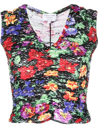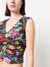 floral-print ruched vest top Highlights - Black/multicolour - All-over floral print - Ruched bodice - Cropped - V-neck - Sleeveless Imported Composition Fabric 100% SIZE & FIT Model measurements Height 5 ft 10 in(1.78 m) Bust/Chest 33.46 in(85 cm) Hips 36.22 in(92 cm) Waist 23.22 in(59 cm) Measurement LENGTH 15.35 in(39 cm) BUST 29.13 in(74 cm) FittingInformation This piece fits true to size. We recommend you get your regular size Cut for a close fit Made with a mid-weight stretch fabric Washing instructions Dry Clean Only