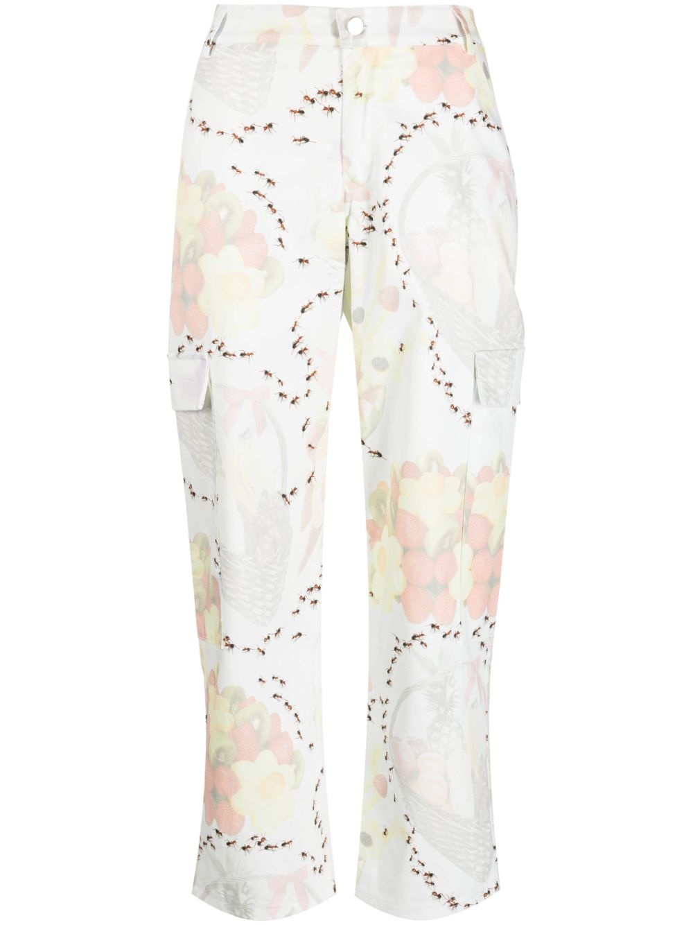 graphic-print trousers Highlights - White/multicolour - Cotton - All-over graphic print - Mid-rise - Belt loops - Front button and zip fastening - Two side inset pockets - Two side cargo pockets - Two rear patch pockets Made in United States Composition Cotton 100% SIZE & FIT Model measurements Height 5 ft 10 in(1.77 m) Bust/Chest 31.49 in(80 cm) Hips 35.43 in(90 cm) Waist 25.19 in(64 cm) FittingInformation Designed for a straight-leg fit, these trousers allow for a close fit at the waist and an unrestricted, comfortable fit over the leg Cropped in length Made from a midweight non-stretch fabric This piece fits true to size – take your usual size