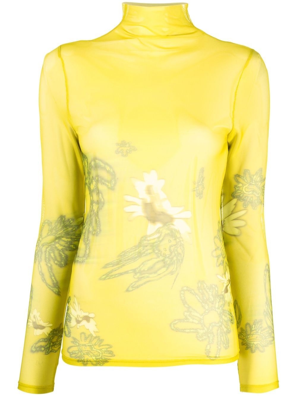 lace-embroidered long-sleeve top Highlights - Lime green - Stretch-design - Semi-sheer construction - Floral-lace detailing - Funnel neck - Long sleeves Made in United States Composition Nylon 82%, Spandex/Elastane 18% SIZE & FIT Model measurements Height 5 ft 10 in(1.78 m) Bust/Chest 31.49 in(80 cm) Hips 36.22 in(92 cm) Waist 25.59 in(65 cm) FittingInformation This piece fits true to size. We recommend you get your regular size Cut for a close fit Made with a lightweight stretch fabric