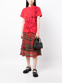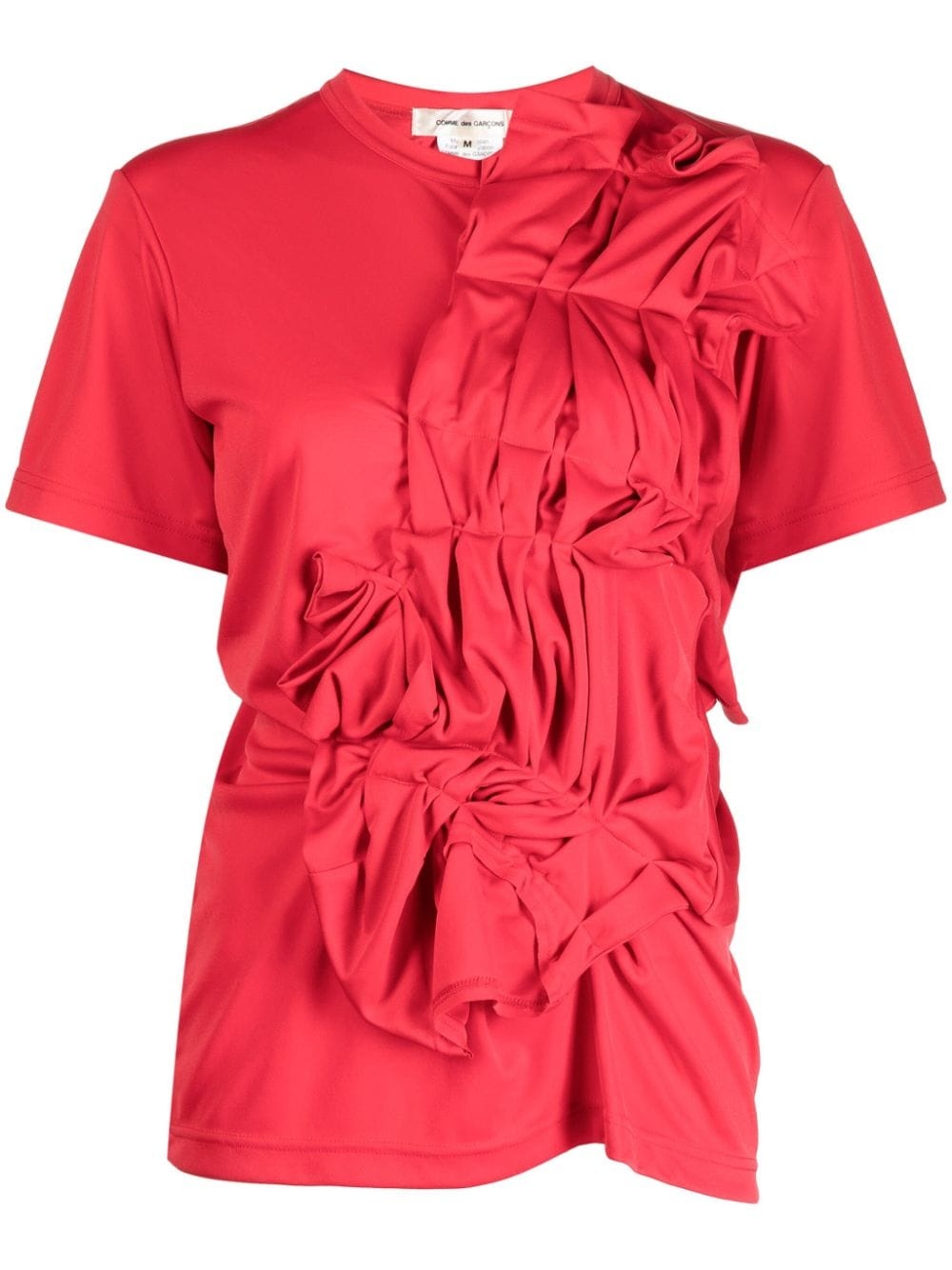 asymmetric gathered-detailing T-shirt Highlights - Poppy red - Asymmetric design - Gathered detailing - Tonal stitching - Crew neck - Short sleeves - Straight hem Imported Composition Polyester 100% SIZE & FIT Model measurements Height 5 ft 10 in(1.77 m) Bust/Chest 28.74 in(73 cm) Hips 35.82 in(91 cm) Waist 24.4 in(62 cm) FittingInformation Designed for a slim fit that sits just away from the body offering a close yet comfortable fit Made from a midweight non-stretch fabric, this piece offers minimal elasticity when worn This piece fits true to size – take your usual size Washing instructions Hand Wash
