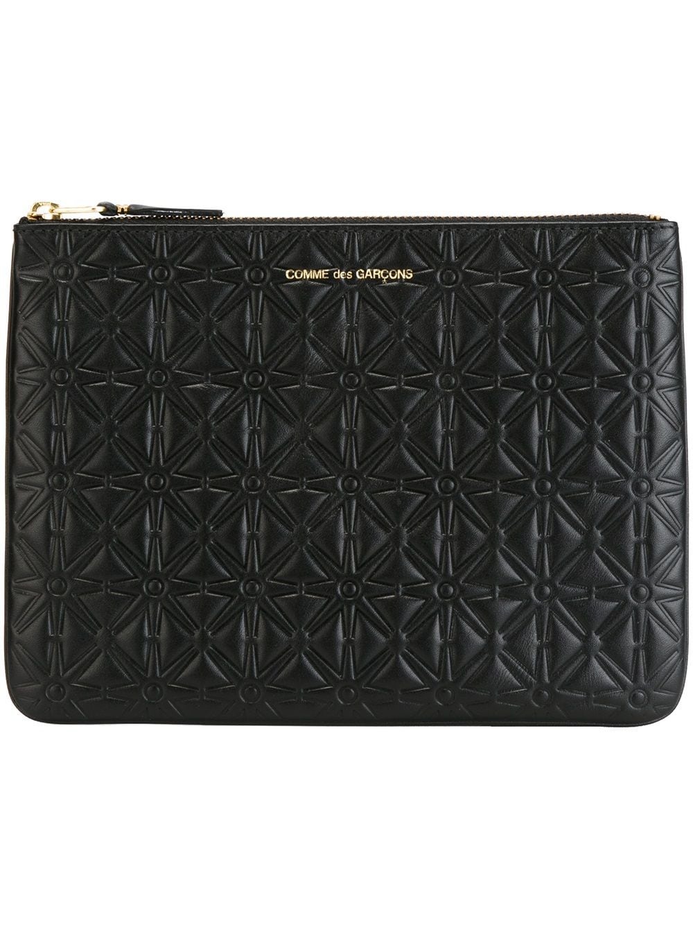'Classic Embossed A' purse Black leather 'Classic Embossed A' purse from Comme Des Garcons Wallet featuring a front centre logo stamp and a gold-tone top zip fastening. Please note this item is unisex and sold in men's sizing. Imported Composition Calf Leather 100% SIZE & FIT Measurement WIDTH 6.29 in(16 cm) LENGTH 8.66 in(22 cm)