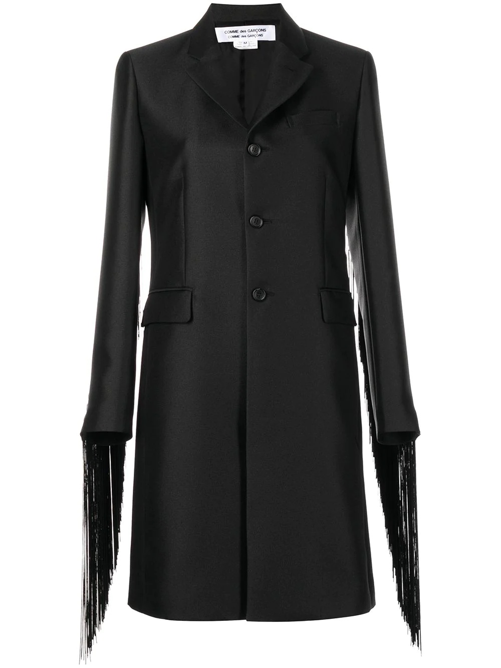fringe-sleeve single-breasted coat black fringe detailing notched lapels chest welt pocket long sleeves buttoned cuffs front button fastening two front flap pockets central rear vent knee-length Imported Composition Polyester 100% SIZE & FIT Model measurements Height 5 ft 10 in(1.77 m) Bust/Chest 33.85 in(86 cm) Hips 35.03 in(89 cm) Waist 24.01 in(61 cm) Washing instructions Dry Clean Only