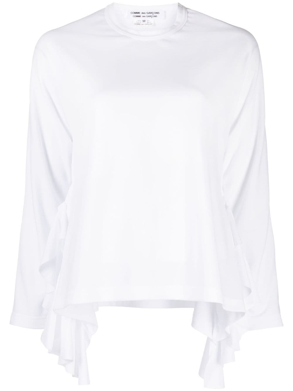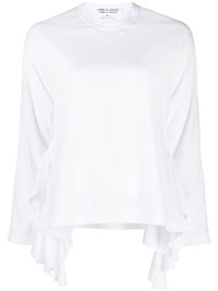 long-sleeve draped top This white top by Comme Des Garcons Comme Des Garcons is designed to a relaxed silhouette and made unique with floaty draped detailing at the hem. Highlights - White - Crew neck - Long sleeves - Straight hem - Draped detailing Imported Composition Polyester 100% SIZE & FIT Model measurements Height 5 ft 9 in(1.76 m) Bust/Chest 33.46 in(85 cm) Hips 37 in(94 cm) Waist 23.62 in(60 cm) FittingInformation Designed to be unstructured, offering a loose fit throughout Made from a midweight non-stretch fabric, this piece offers minimal elasticity when worn This piece fits true to size – take your usual size Washing instructions Hand Wash