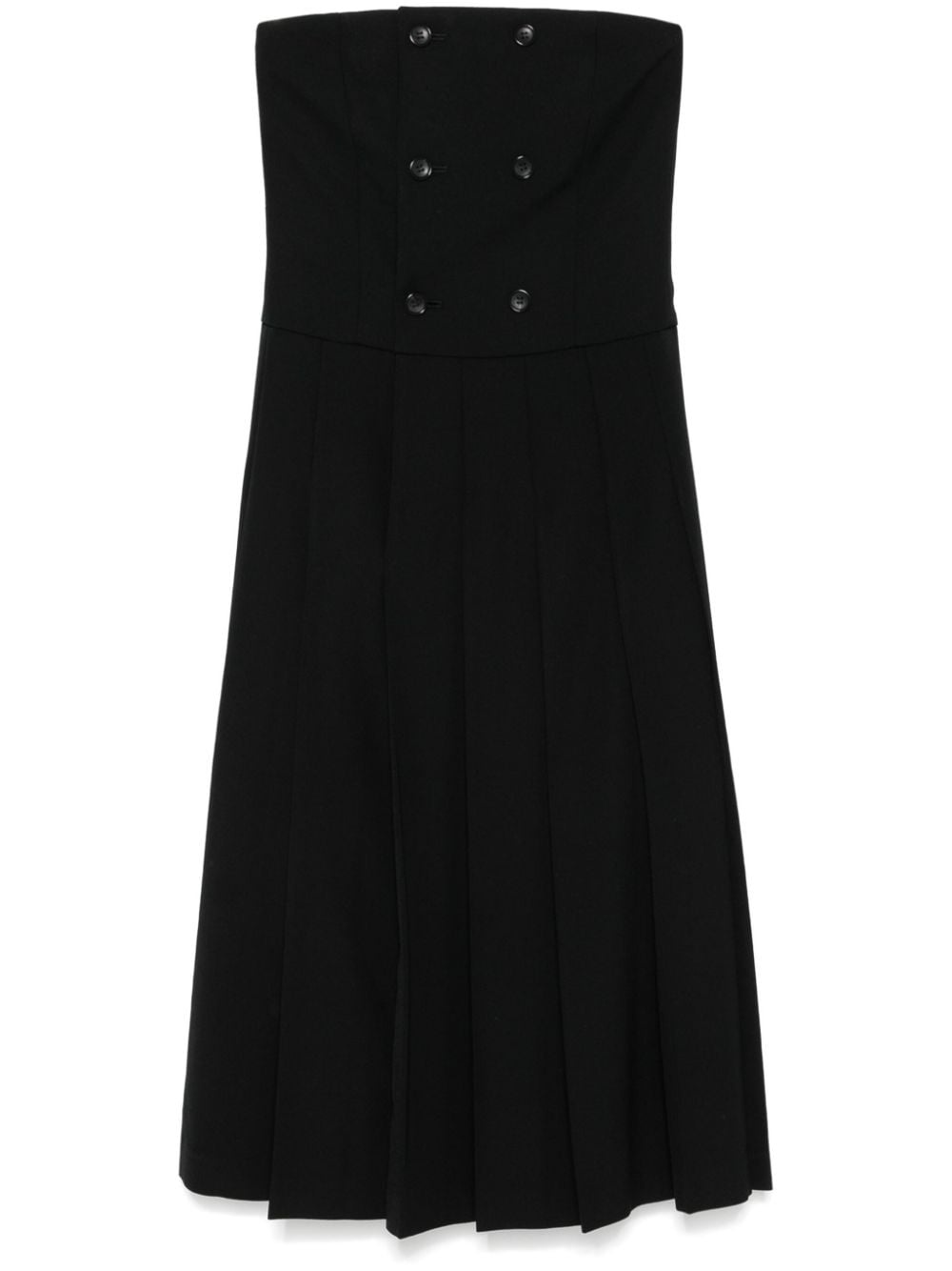 pleated midi dress Highlights - Black - Wool - Twill weave - Pleated skirt - Double-breasted button fastening - Off-centre front zip fastening - Square neck - Strapless - Boned bodice - Belted waist - Two side inset pockets - Unlined - Straight hem - Mid-length Imported Composition Lining: Cupro 100% Outer: Wool 100% SIZE & FIT Model measurements Height 5 ft 11 in(1.8 m) Bust/Chest 31.49 in(80 cm) Hips 36.61 in(93 cm) Waist 24.4 in(62 cm)