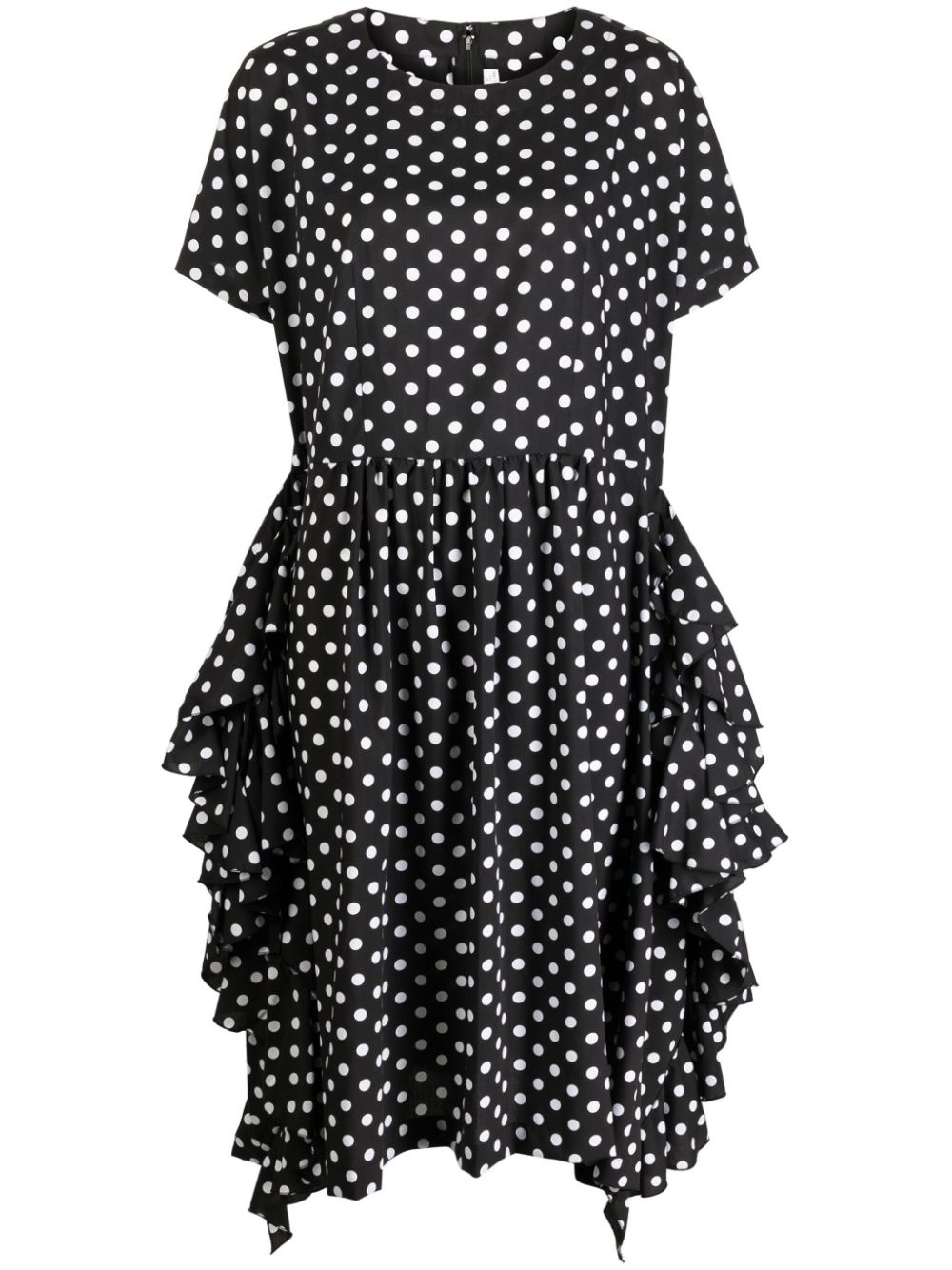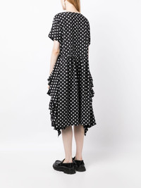 polka-dot print ruffle-detailing dress Highlights - Black/off-white - Ruffled detailing - Polka dot print - Round neck - Short sleeves - Flared hem - Mid-length Imported Composition Polyester 100% SIZE & FIT Model measurements Height 5 ft 10 in(1.79 m) Bust/Chest 31.49 in(80 cm) Hips 34.64 in(88 cm) Waist 22.83 in(58 cm) FittingInformation Designed to be unstructured, offering a loose fit throughout Made from a midweight non-stretch fabric This piece fits true to size – take your usual size Washing instructions Dry Clean Only