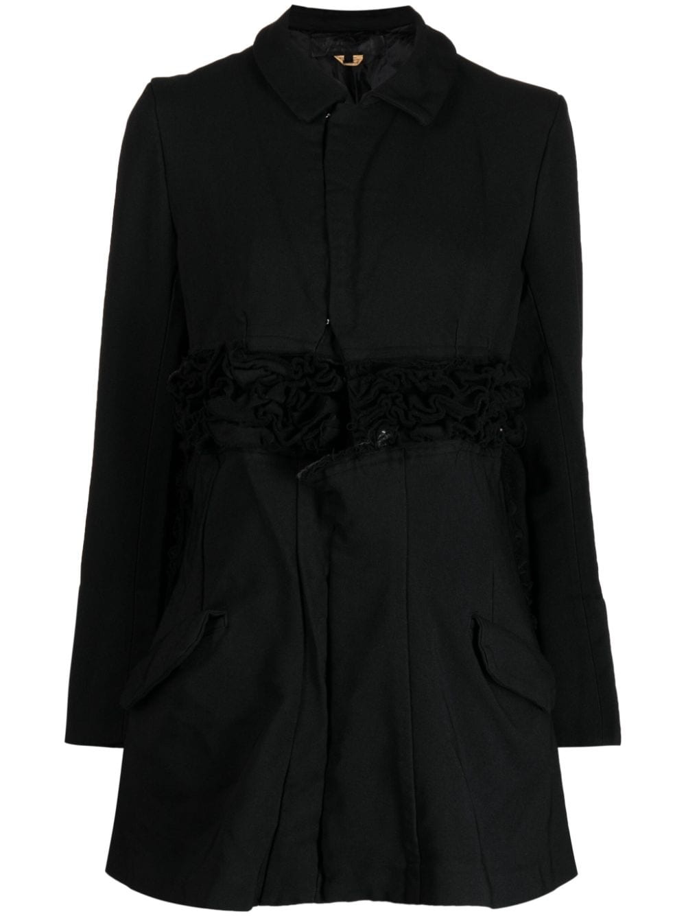ripped ruffled bomber jacket Highlights - Black - Ruffled detailing - Ripped detailing - Spread collar - Concealed front fastening - Two side flap pockets - Long sleeves - Straight hem Imported Composition Outer: Polyester 100% Lining: Polyester 100% SIZE & FIT Model measurements Height 5 ft 9 in(1.76 m) Bust/Chest 31.1 in(79 cm) Hips 35.03 in(89 cm) Waist 24.4 in(62 cm) FittingInformation Designed to be unstructured, offering a loose fit throughout The internal shoulder pads offer a structured shape Made from a midweight non-stretch fabric This piece fits true to size – take your usual size