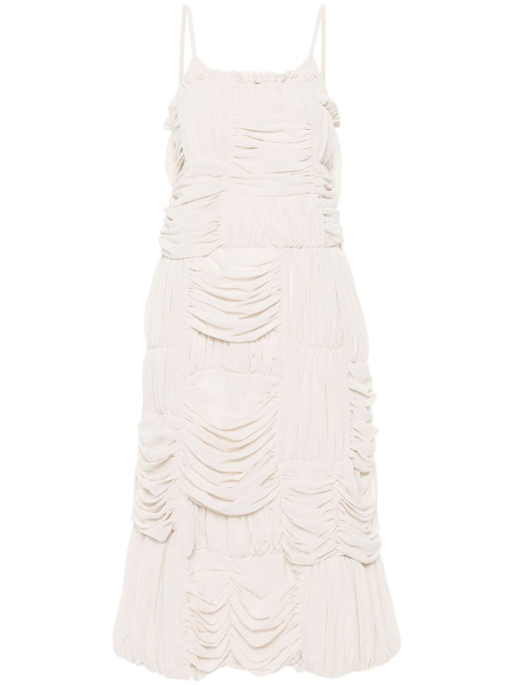 ruched midi dress Highlights - Light beige - Georgette crepe - Panelled design - Ruched detailing - Spaghetti straps - Sleeveless - Round neck with ruffled trim - Two side inset pockets - Mid-length - Straight hem - Concealed rear hook and zip fastening Imported Composition Polyester 100% SIZE & FIT Model measurements Height 5 ft 9 in(1.76 m) Bust/Chest 31.1 in(79 cm) Hips 36.61 in(93 cm) Waist 24.8 in(63 cm) FittingInformation Designed to be unstructured, offering a loose fit throughout Made from a midweight non-stretch fabric This piece fits true to size – take your usual size
